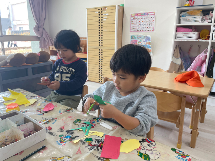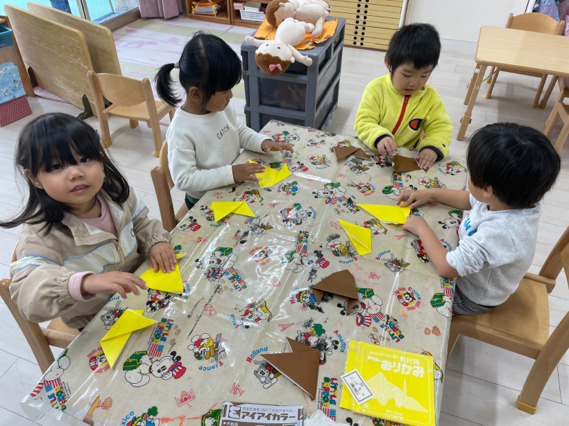 初めての折り紙、久しぶりのはさみで「先生どうやるの〜」と苦戦しつつも、自分でやってみようと頑張っていましたよ!
