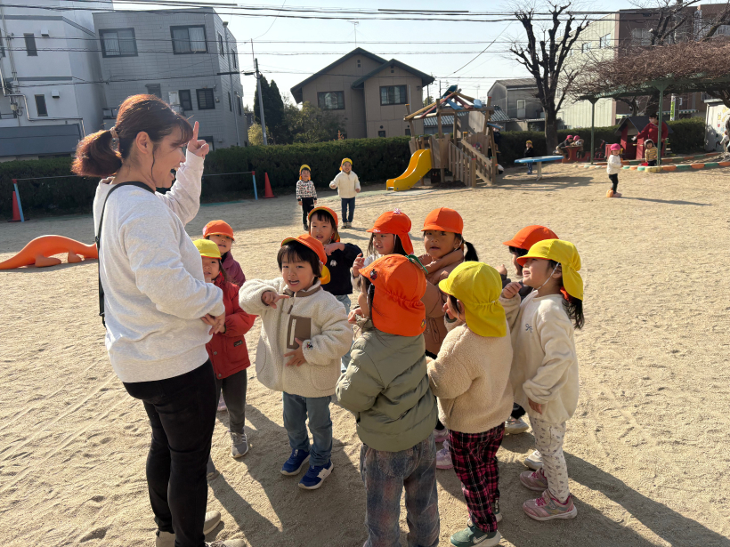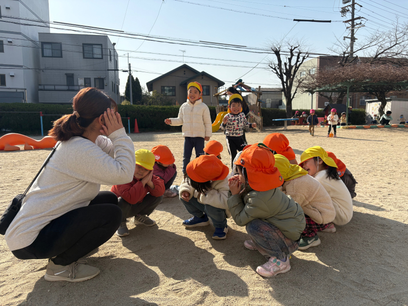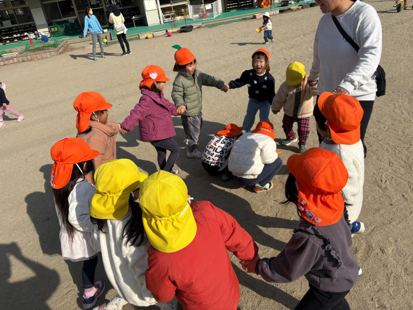 最近外遊びの最後にみんなで集団遊びをしてから入室しています。