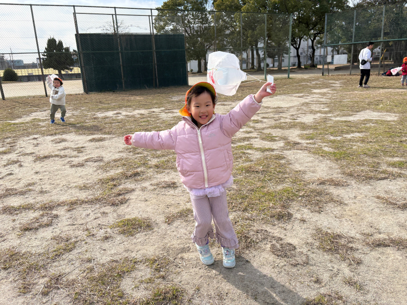 風が吹くと少し立ち止まって、手を挙げているだけでも凧が飛ぶことに気づいた子たちもいました。