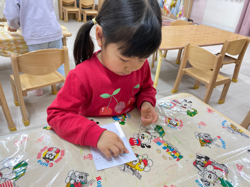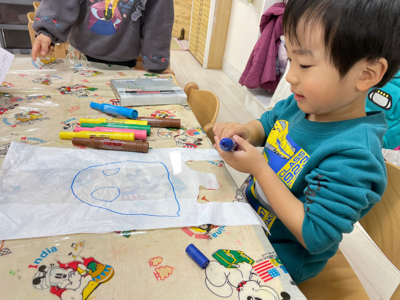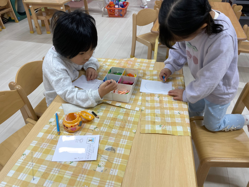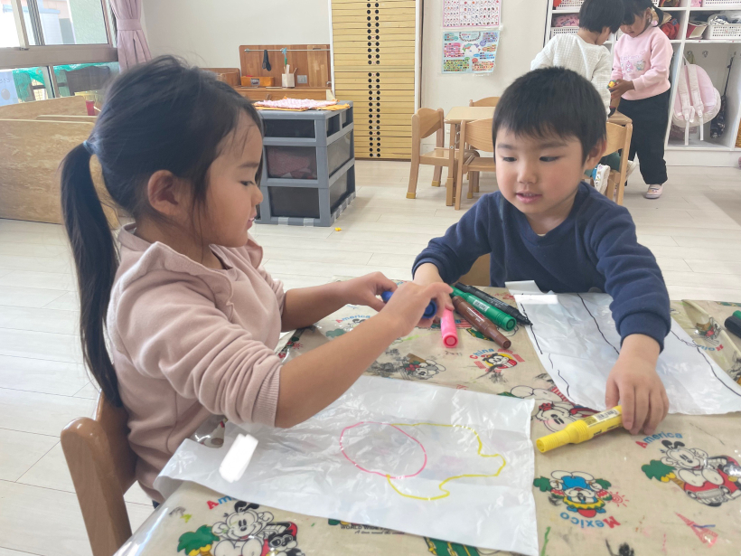 ペンの貸し借りのやりとりも可愛く、「赤(ペン)どこだー?」「ここ!今使ってる!待ってね!」「終わった!どうぞ〜」「黄色届かない〜」「黄色?ここにあるよ!はい!」と終始平和な雰囲気で作っていました。