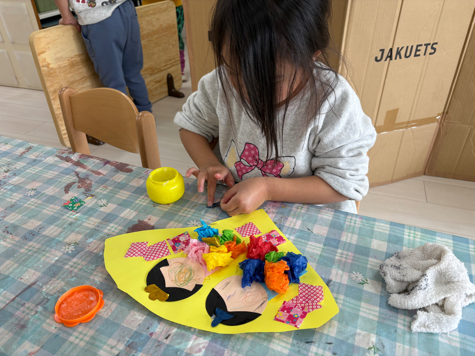 好きな色のお花紙を選んで、クシャクシャに丸めてのりで貼り付けました。