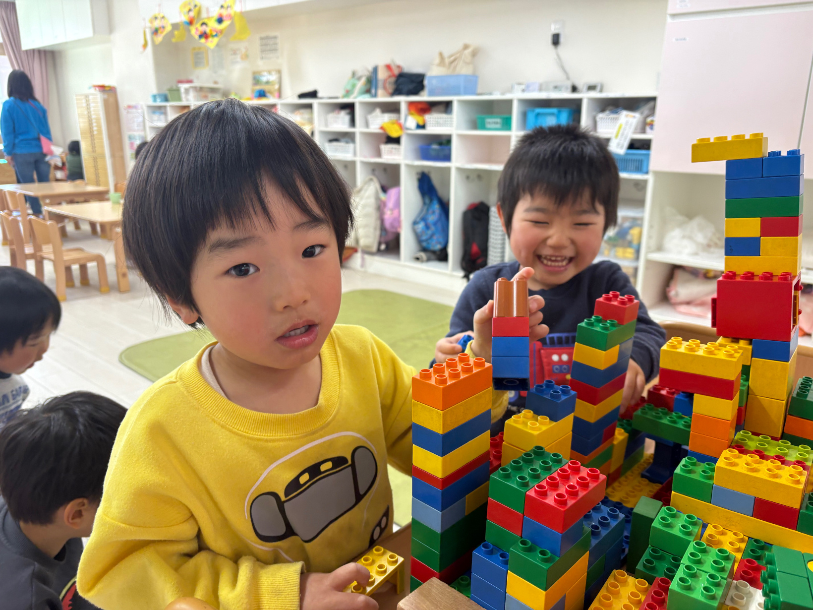 ブロックで遊ぶことが好きな子たちは大きな建物を共同で作り上げています。