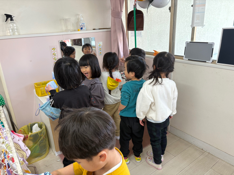 毎日みんなで「手洗い、うがい、トイレ、お茶、時計を見る!」と唱えてからお外で遊んでいるので、今では子どもたちが自分から手洗い場に向かって並んでいます。