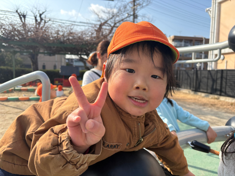 最近はぞうぐみさんやきりんぐみさんの真似をして遊具にぶら下がったり、手を離して足だけで立ってみたりと、少し難しいことにも挑戦して楽しんでいます。