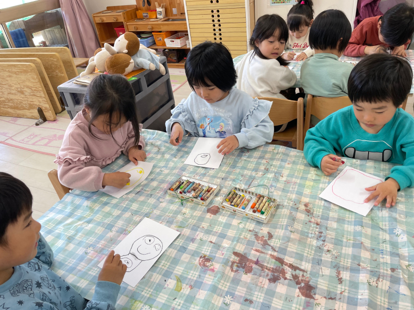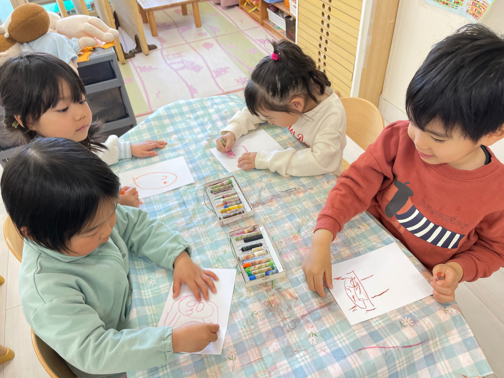 自分の顔を描くことを知らせると、好きな色を使って目や耳、口などを描いたり、周りに自分の好きなもを描いて、自分だけの当番表ができました!