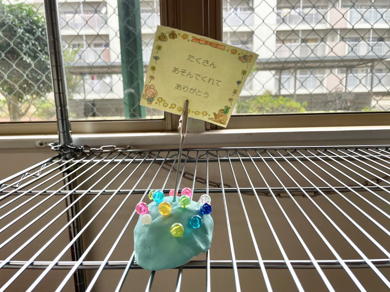 このあとはきりん組にバトンタッチしてビーズを飾り付けてもらい、メッセージカードをつけて完成です!