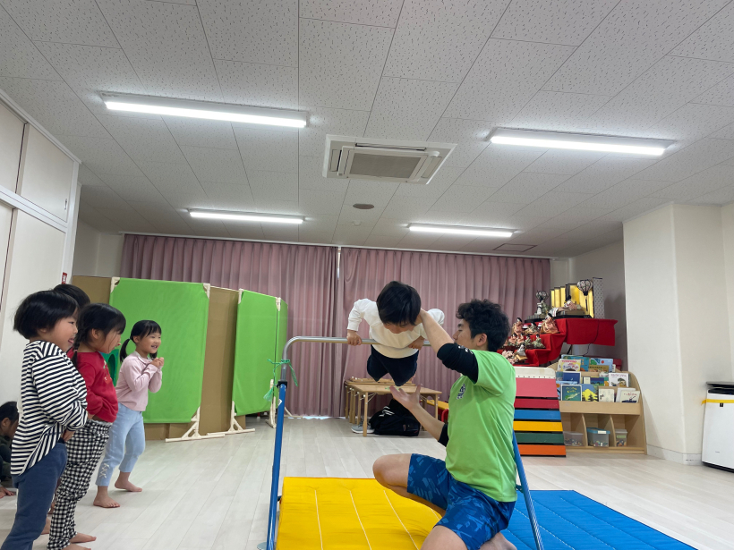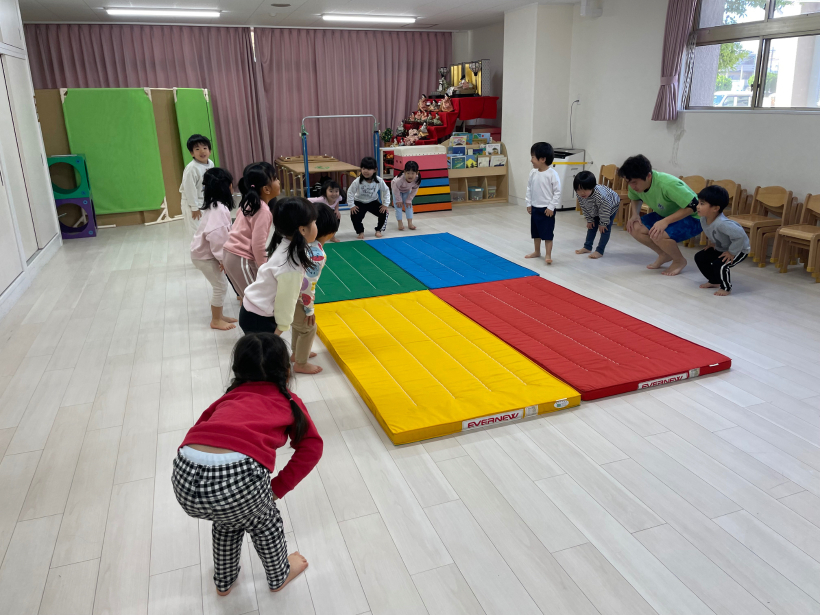 以前もやってきましたが、久しぶりだったので怖がる子もいるのかな…と心配していましたが、先生が助けてくれることで安心して取り組めていました。「がんばってー!」と友だちを励ましたり、励まされたことで頑張ろうと立ち上がる姿を見て、おおきくなったなぁ…と感動しました!
