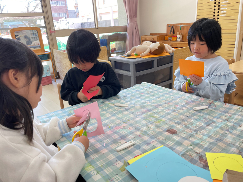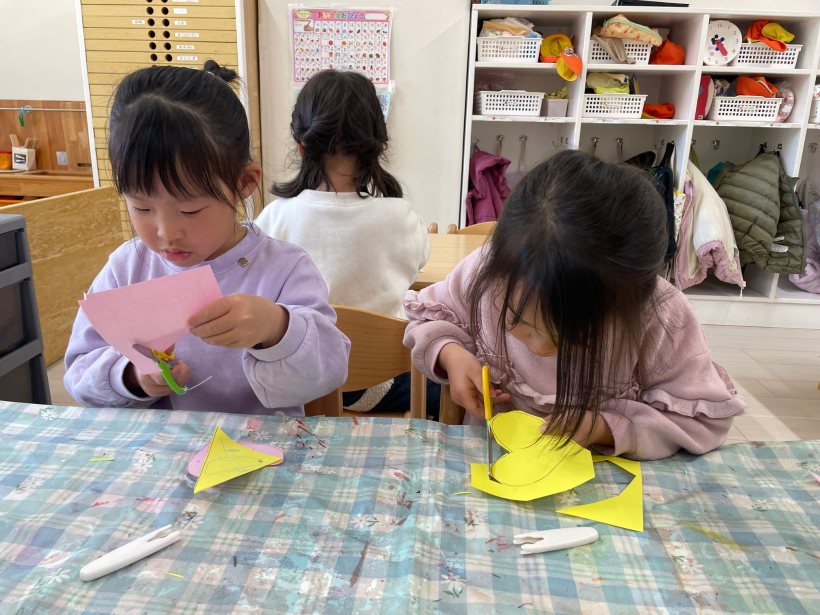 保育室の遊びのコーナーに工作遊びのコーナーを作ると、何度も「もっかいやる!」「次はみどりの星にするー!」と繰り返し楽しむ子もいました!色々な形を切ることに挑戦できるようになりました。切った形や折り紙を使ってのりで貼り合わせたりして製作の意欲がメキメキと上がってきています。