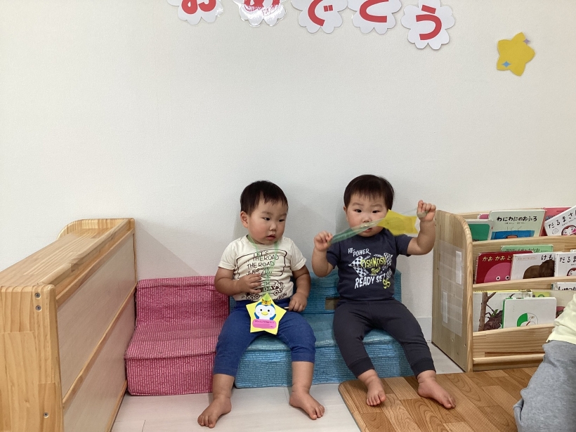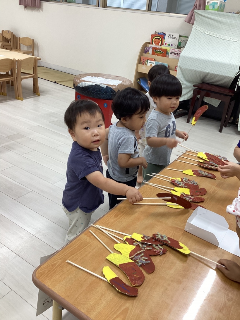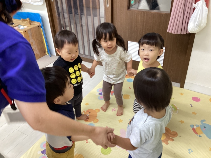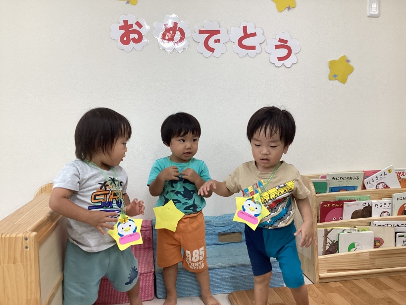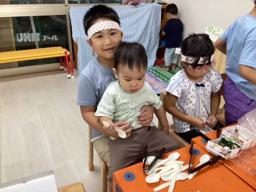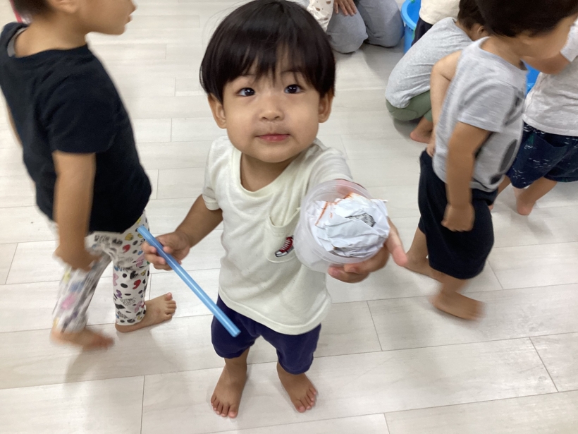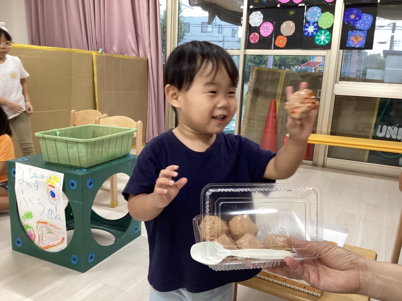 りすぐみクラスだより【9月】 ぞう組のお店屋さんごっこへ行きました。 初めは緊張していたりす組さん。 ぞう組の「いらっしゃいませ」の声にみんな笑顔いっぱいでした。 たこ焼きや、かき氷など買い物を楽しんでいました。 運動会の踊りを始めています。 みんな、曲をかけるとノリノリです♬ お友だちと手をつないで楽しそうに踊っています。 踊り終わった後も「もう一回!」と声があがります! ちょっと休憩^ ^ 9月のお誕生会がありました。 保育者の出し物に興味津々で見ていました。 9月生まれのみんな お誕生日おめでとう!