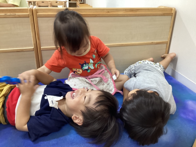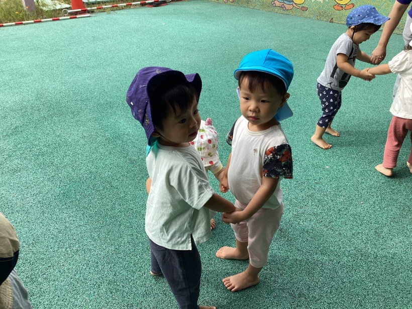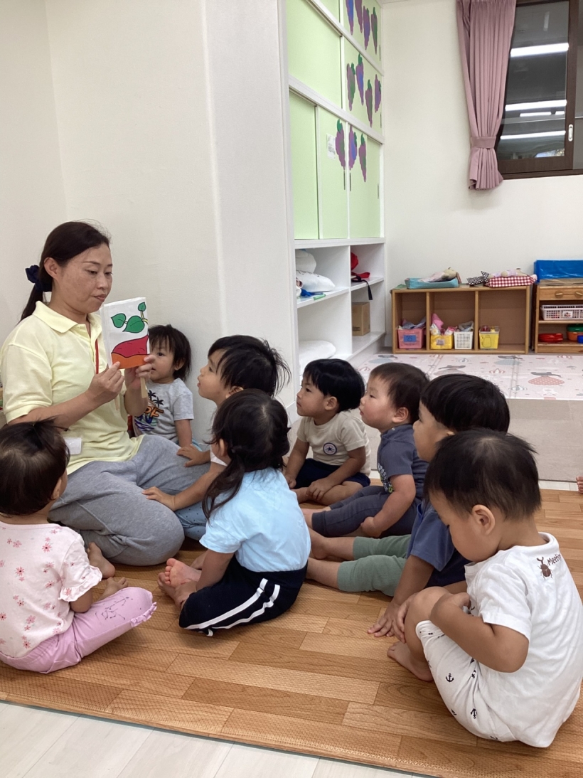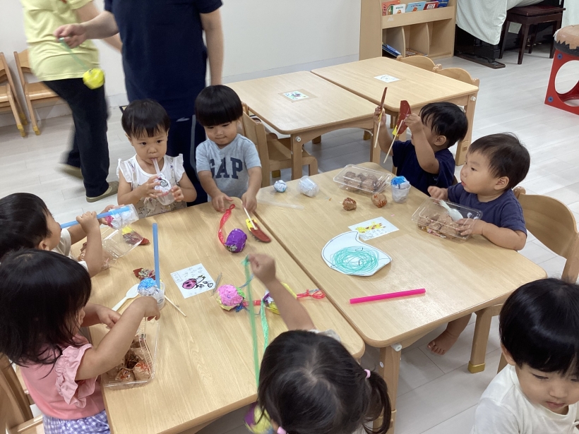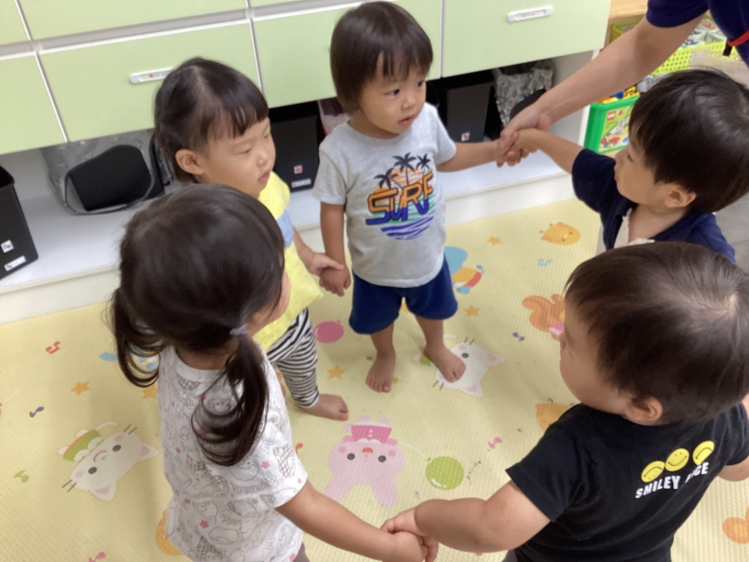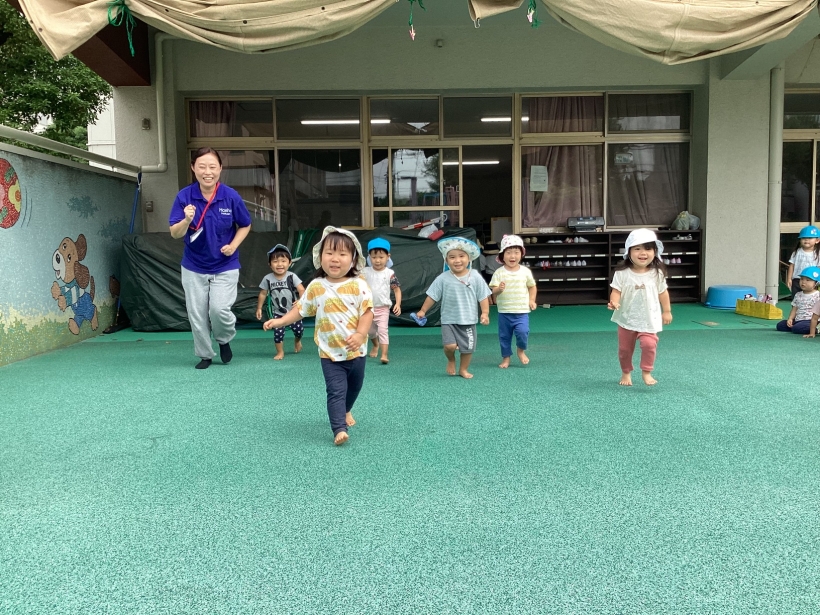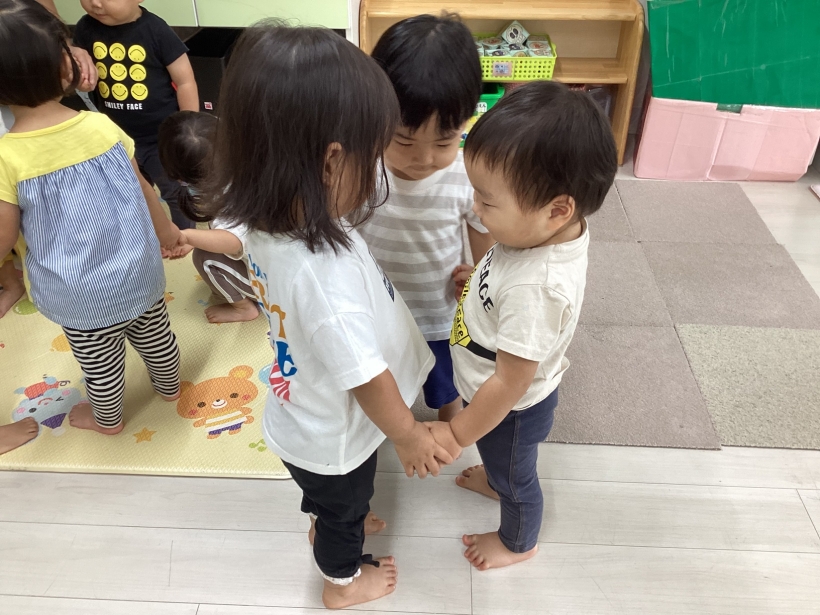 りすぐみクラスだより【9月】 ぞう組のお店屋さんごっこへ行きました。 初めは緊張していたりす組さん。 ぞう組の「いらっしゃいませ」の声にみんな笑顔いっぱいでした。 たこ焼きや、かき氷など買い物を楽しんでいました。 運動会の踊りを始めています。 みんな、曲をかけるとノリノリです♬ お友だちと手をつないで楽しそうに踊っています。 踊り終わった後も「もう一回!」と声があがります! ちょっと休憩^ ^ 9月のお誕生会がありました。 保育者の出し物に興味津々で見ていました。 9月生まれのみんな お誕生日おめでとう!