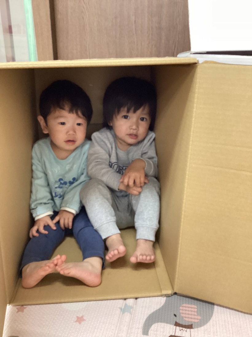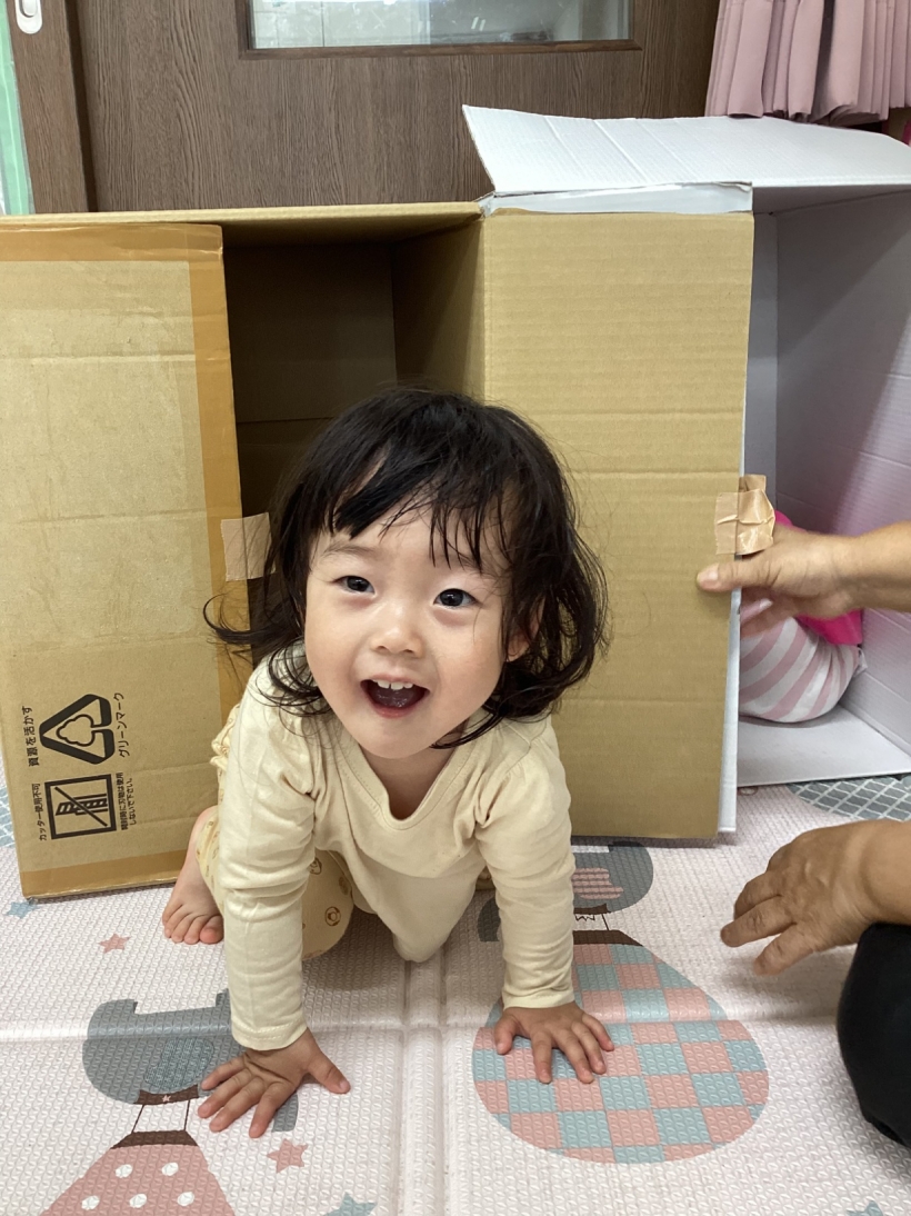 室内ではダンボールのお家に入り、のんびりと過ごしたり、廊下を使って広々と遊びました。