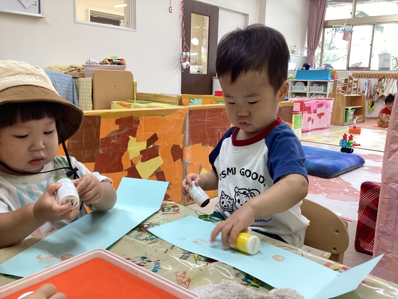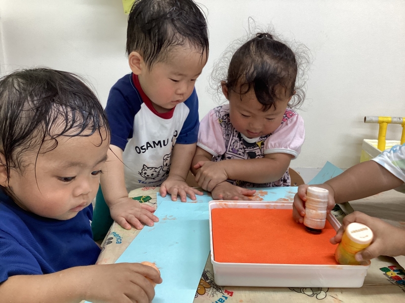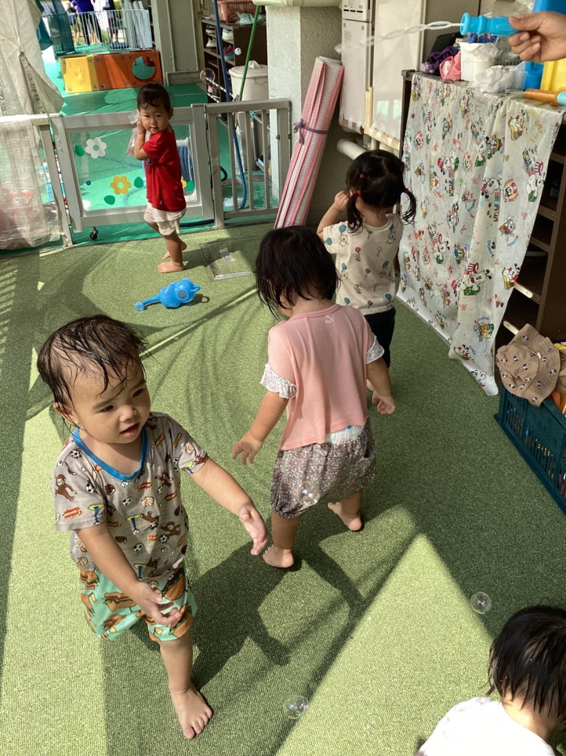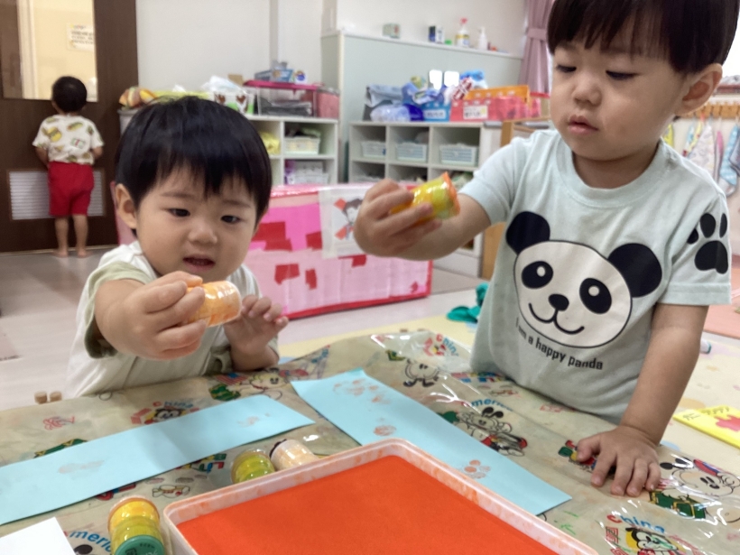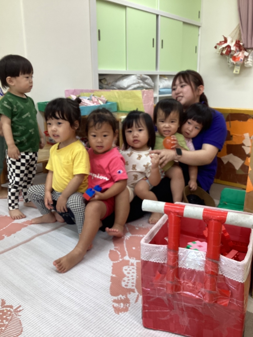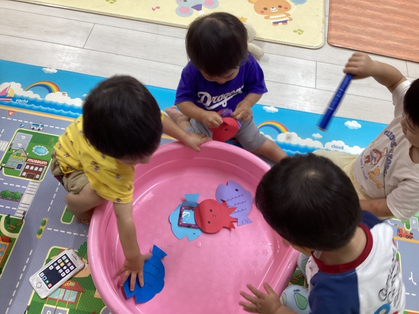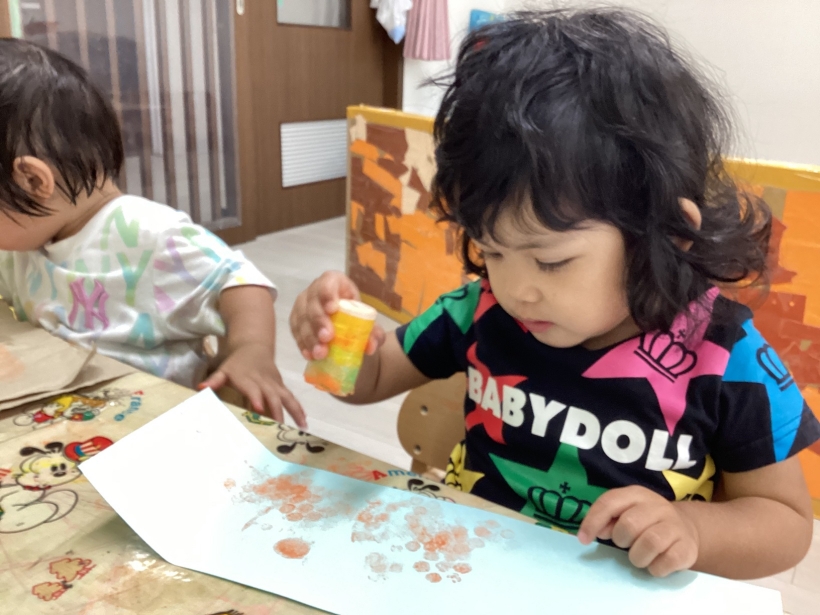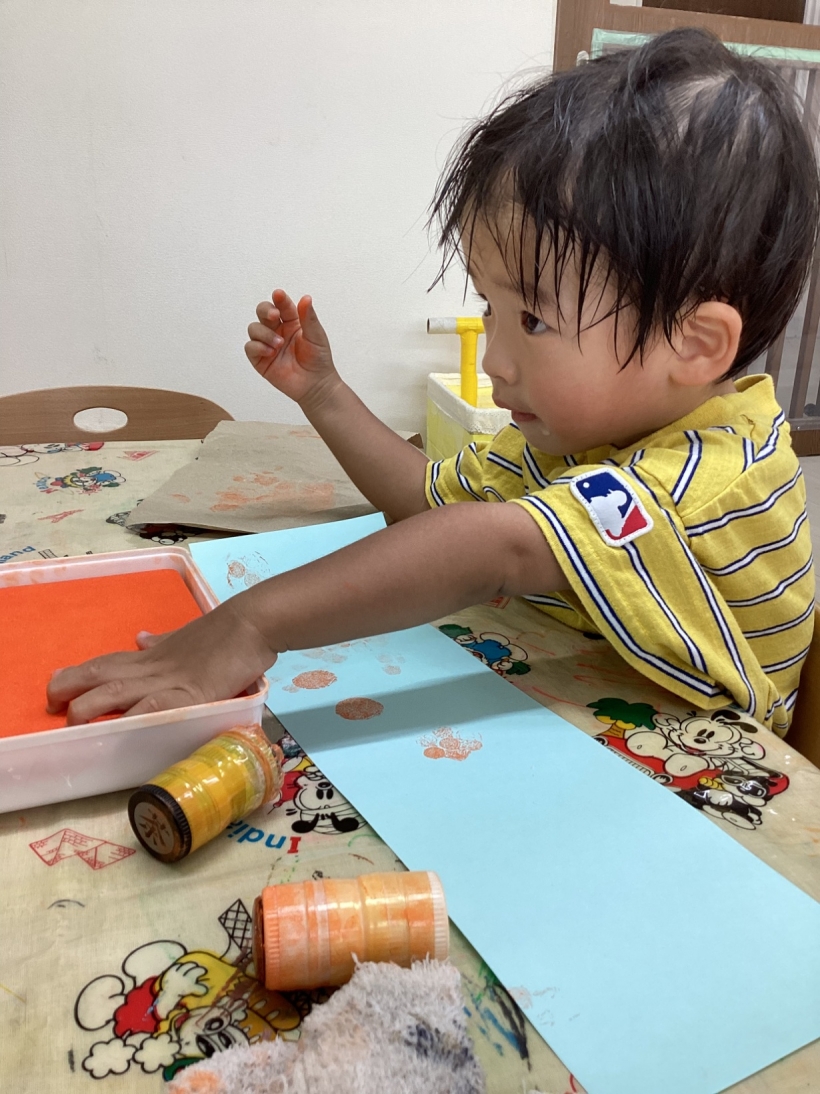 りすぐみだより【9月】 タンポ遊びをしました。「ポンポン」とみんな楽しそうに押していました。 タンポ遊びが終わると、手のひらにもインクをつけて「わぁー」と言いながら画用紙に押していましたよ。 みんなが作った魚で釣りをしたり、積み木で遊んだりと、お部屋の中でも好きな遊びを楽しんでいます。 今シーズン最後の水遊びを楽しみました。 8月生まれのお友だちの誕生会をしました。 保育者が「お弁当バス」のカードシアターをすると、「いちご」「にんじん」と大きな声で答えてくれました。 8月生まれのお友だち お誕生おめでとう!