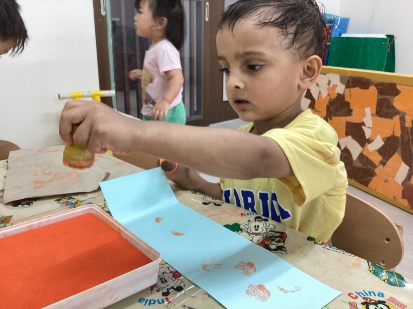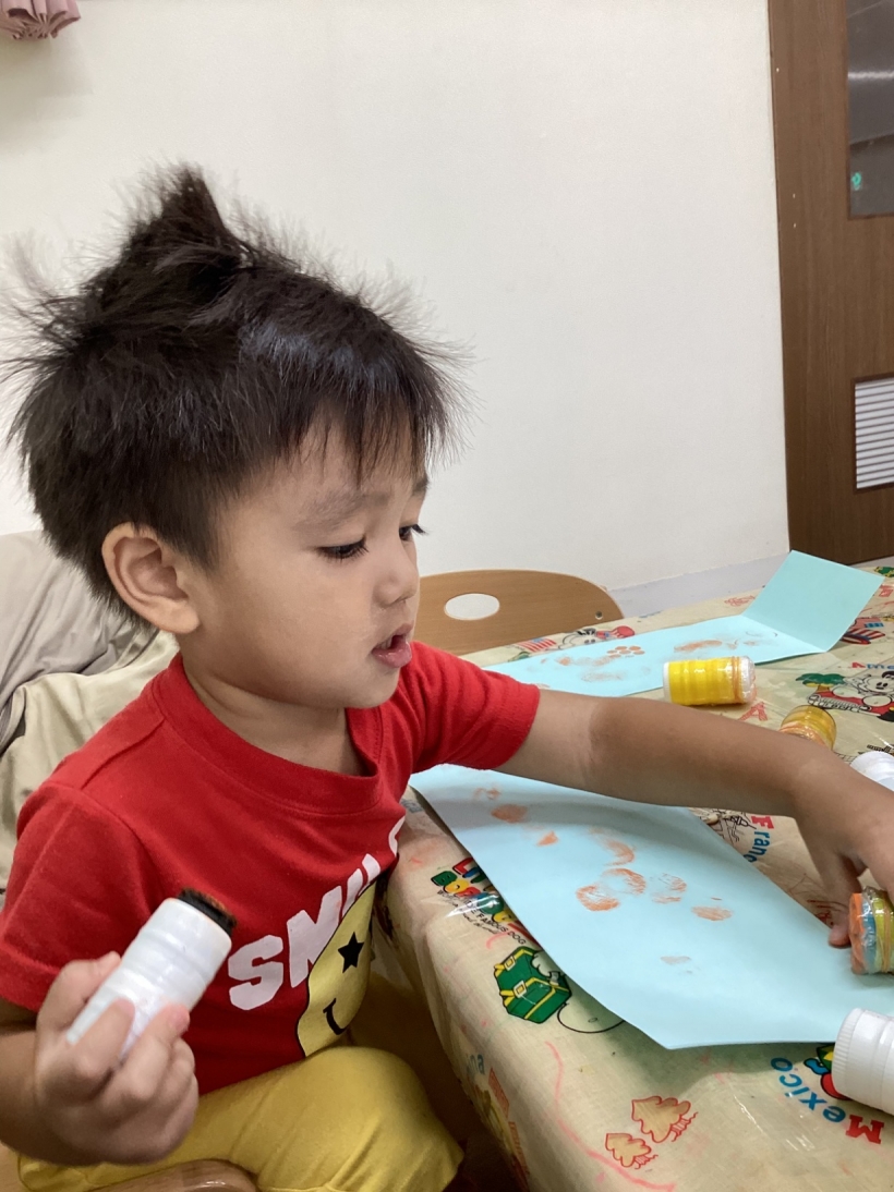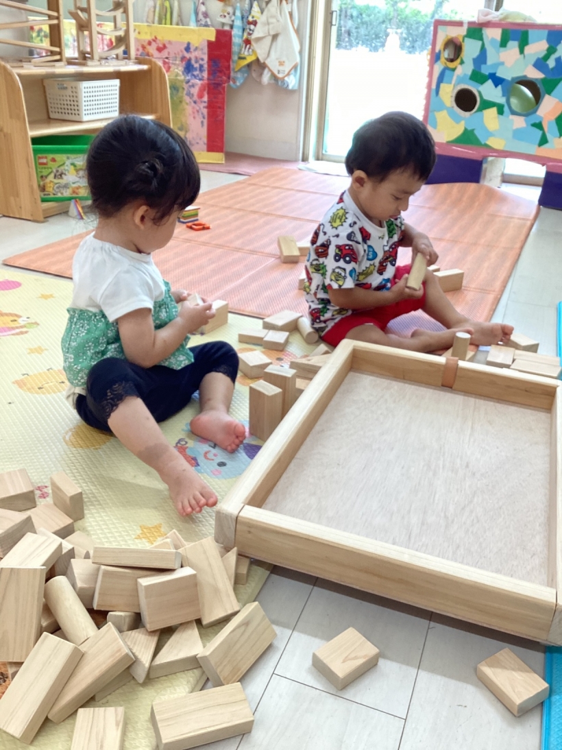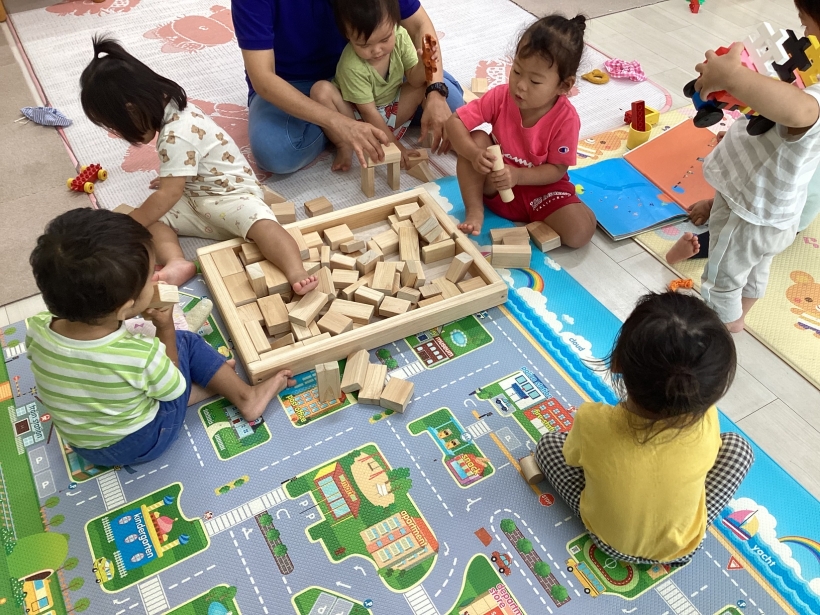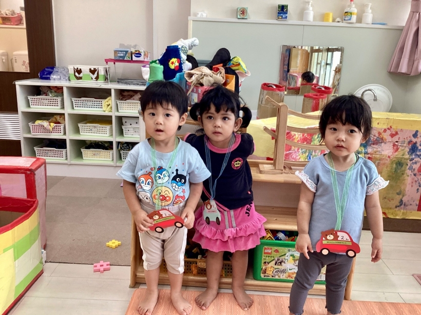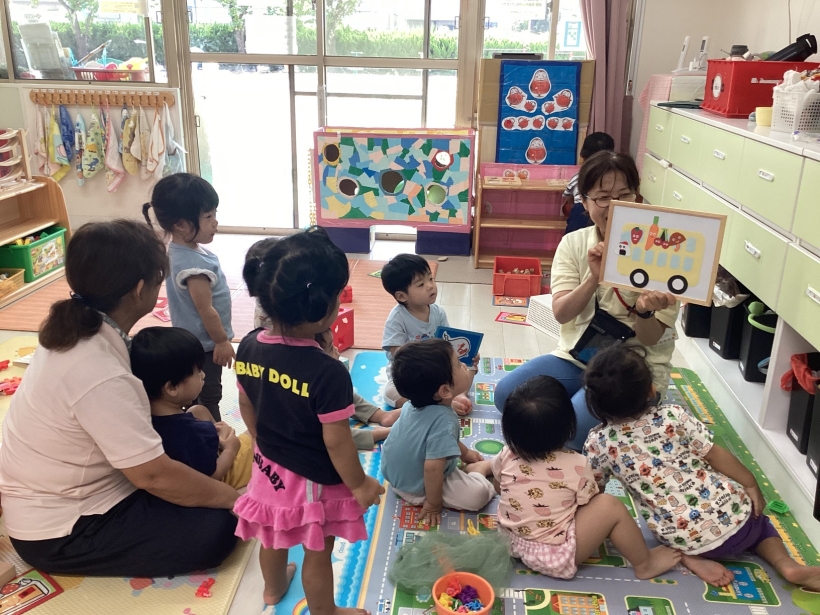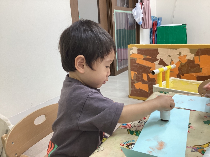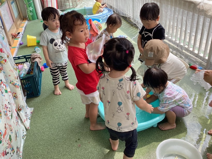 りすぐみだより【9月】 タンポ遊びをしました。「ポンポン」とみんな楽しそうに押していました。 タンポ遊びが終わると、手のひらにもインクをつけて「わぁー」と言いながら画用紙に押していましたよ。 みんなが作った魚で釣りをしたり、積み木で遊んだりと、お部屋の中でも好きな遊びを楽しんでいます。 今シーズン最後の水遊びを楽しみました。 8月生まれのお友だちの誕生会をしました。 保育者が「お弁当バス」のカードシアターをすると、「いちご」「にんじん」と大きな声で答えてくれました。 8月生まれのお友だち お誕生おめでとう!