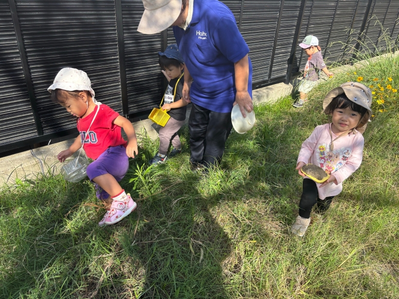 みんなでコオロギやチョウなど色々な虫を捕まえて観察したり、触ってみたりしました。