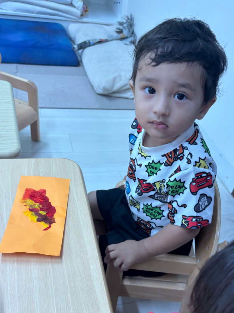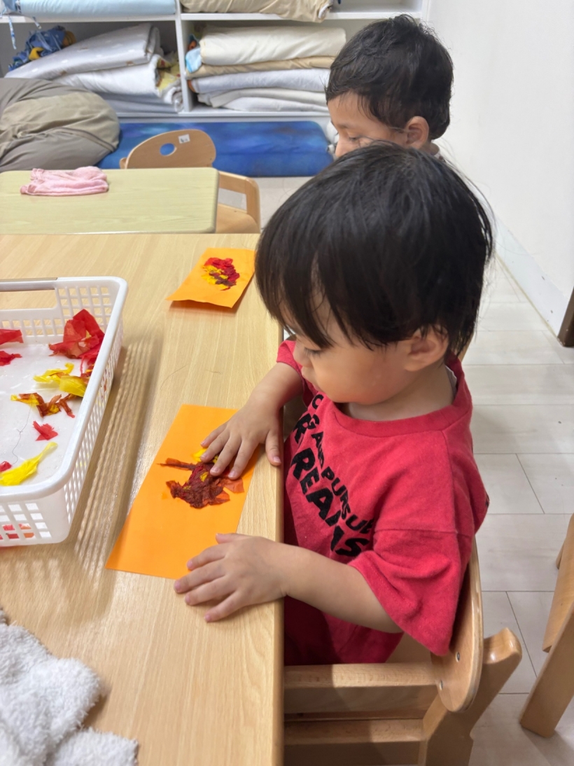 ちぎった花紙は濡らして画用紙に貼り、落ち葉を作りました。