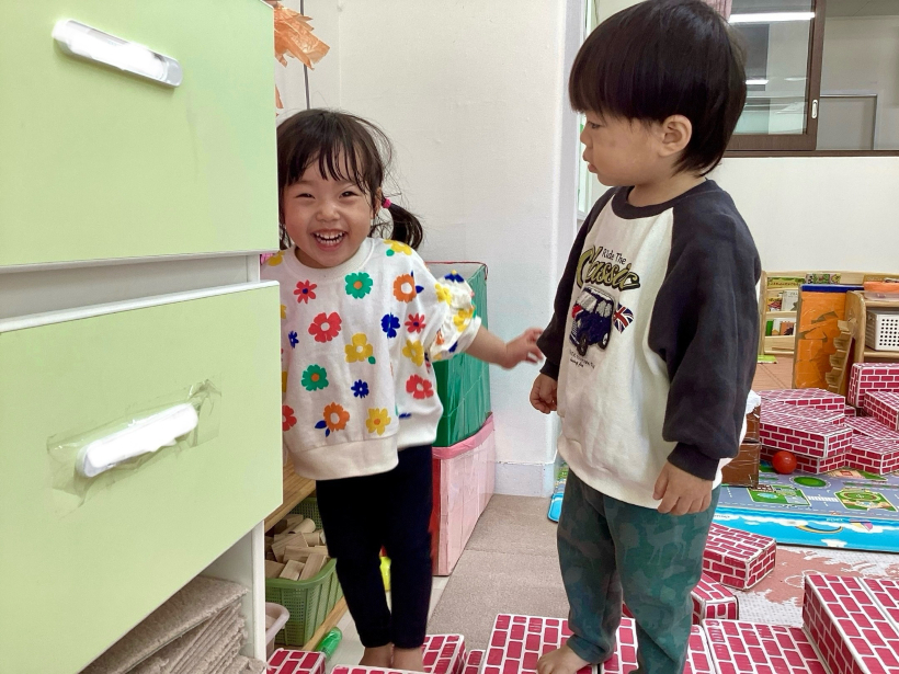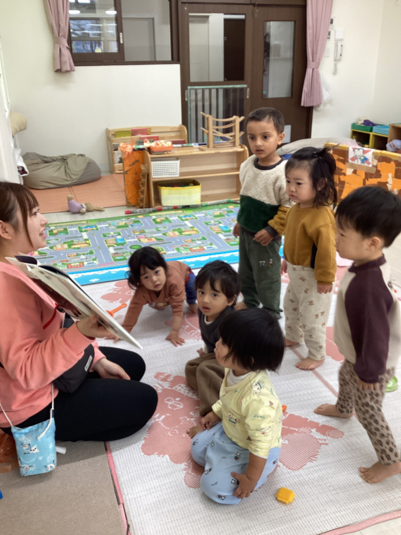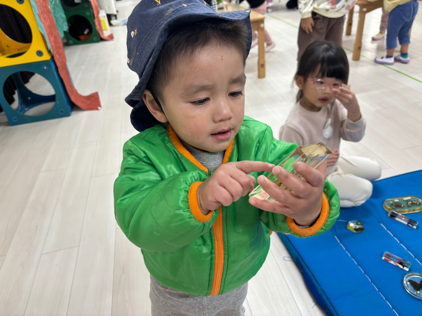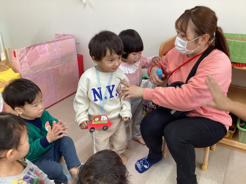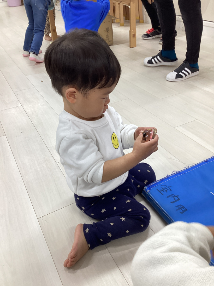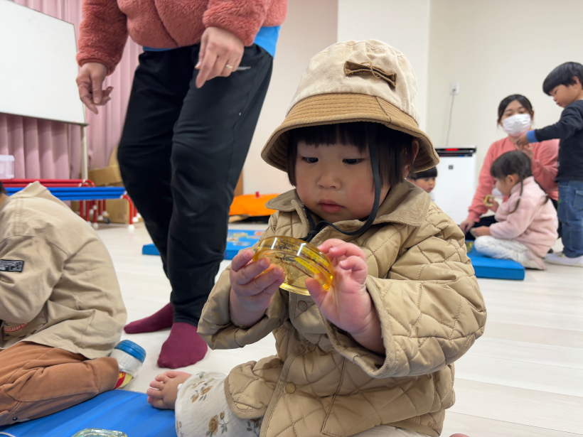 保育者が「魔法の箱」の出し物をすると興味津々のりす組さん。