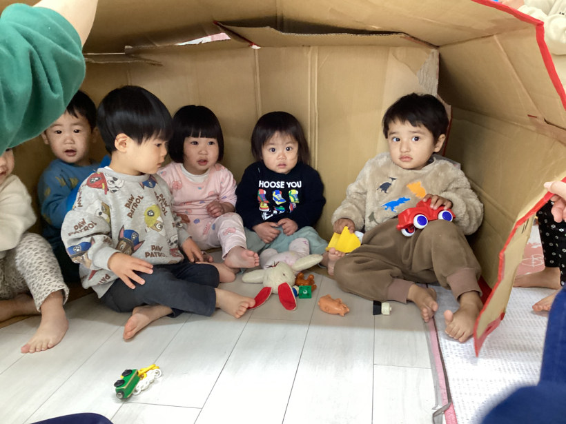 お部屋の中にダンボールを出してお家に見立てると、次々に集まってきてお家の中に入っていました。
