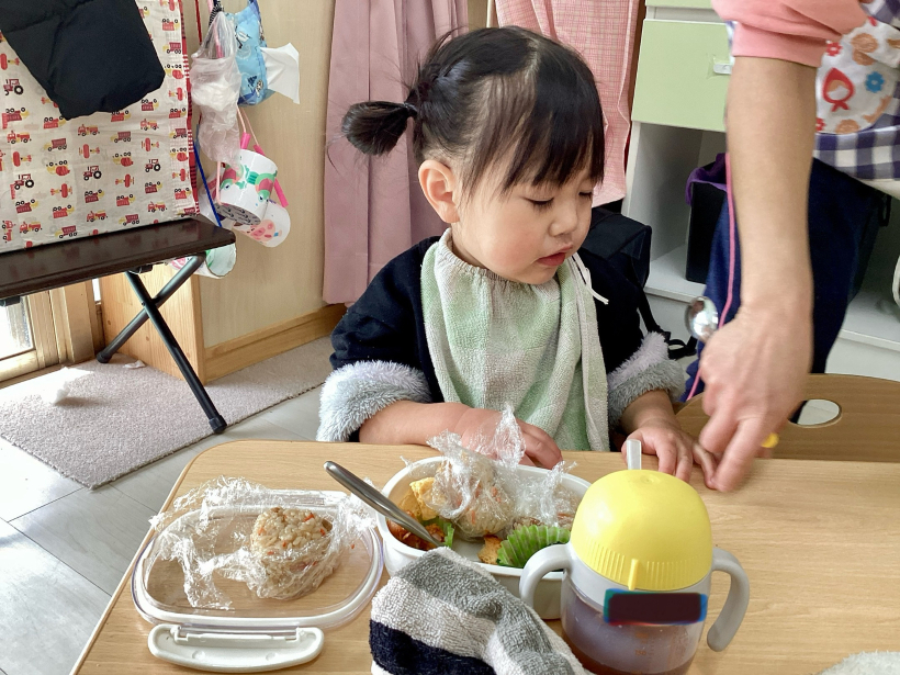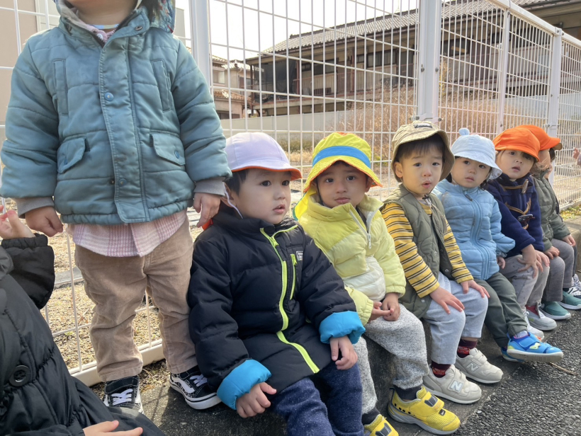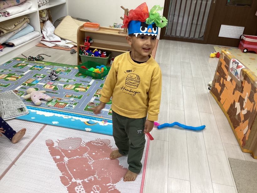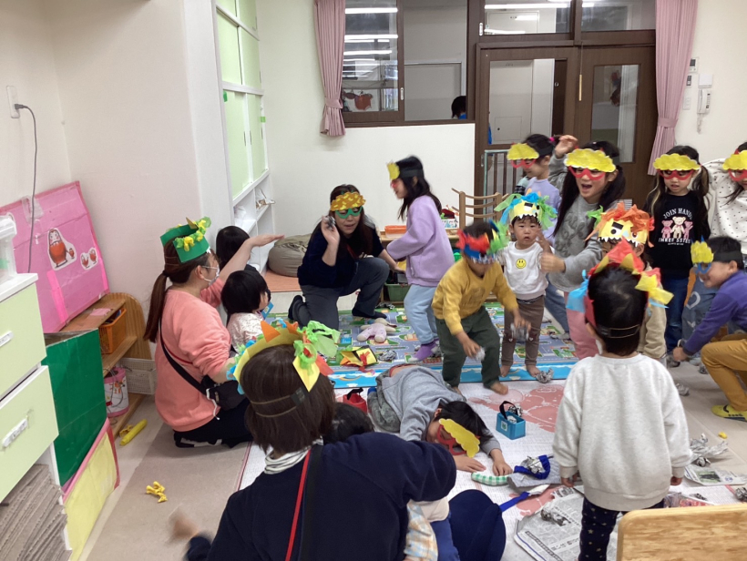 りす組さんも鬼のお面を作ったので、可愛い鬼のお面をつけて豆まきをしました。
