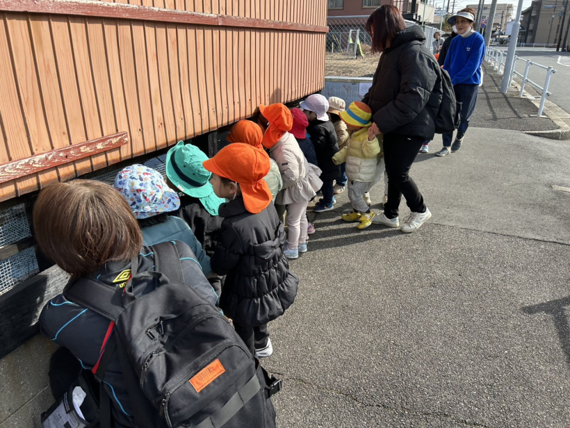 遠足の日は、乳児3クラスで一緒に電車を見に行きました。