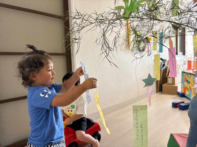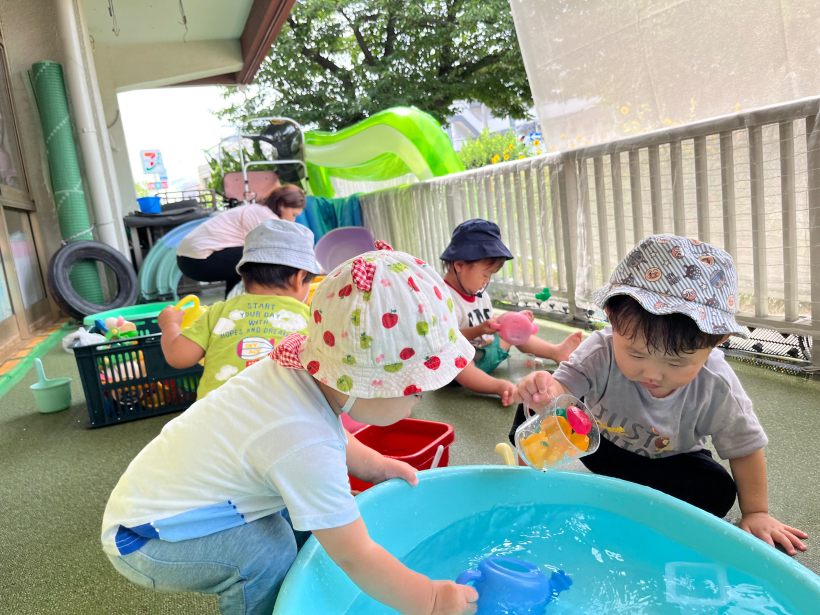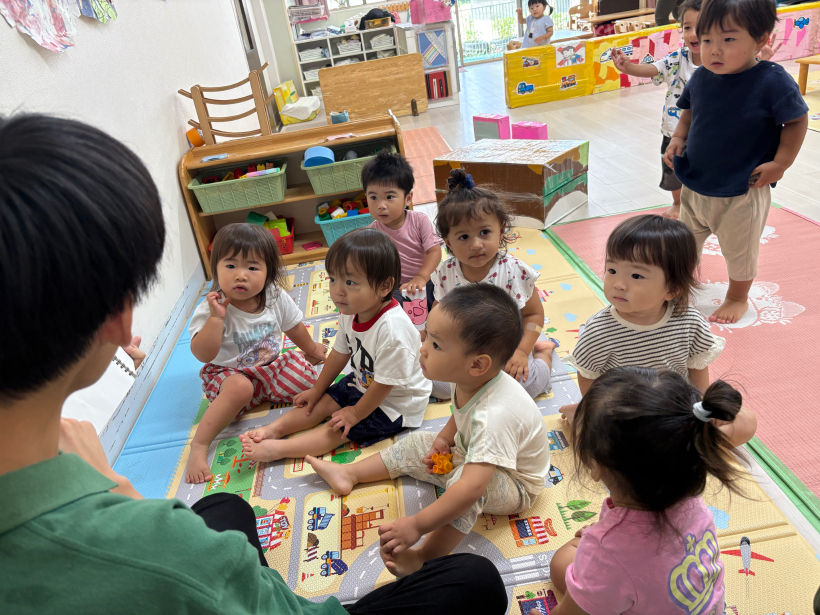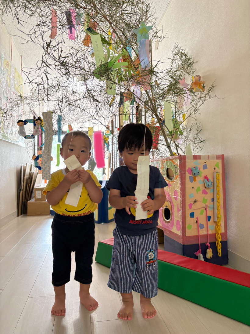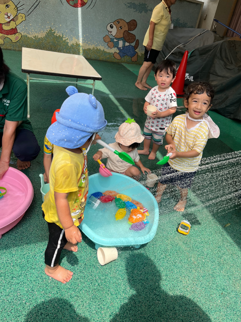りすぐみだより【7月】 七夕でみんなで作った飾りや短冊を飾ると興味津々に短冊を見て楽しんでいました。 みんなのお願い事叶いますように! 暑い日が続きますが、水遊びや氷遊びをして過ごしました。 顔に水がかかってもへっちゃらで楽しんでいました。 7月生まれのお友だちの誕生日会をしました。 「虫眼鏡覗いてみたら」というスケッチブックシアターをすると「きりんさん」など知っている動物の名前を言う子もいました。