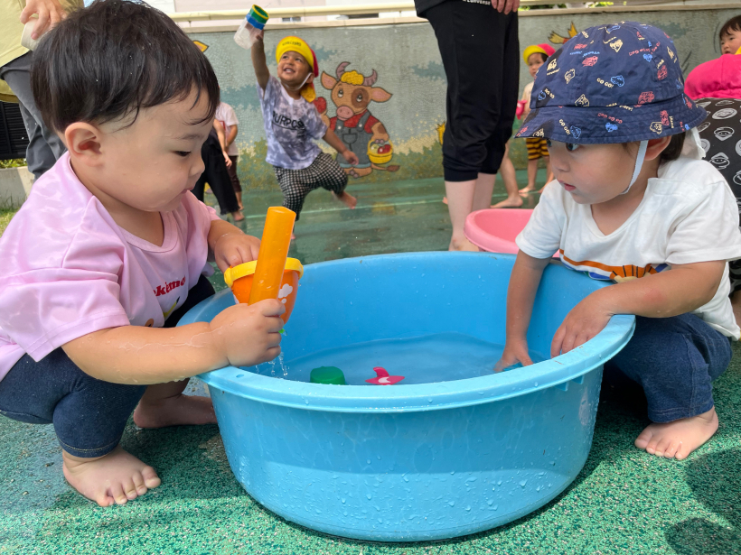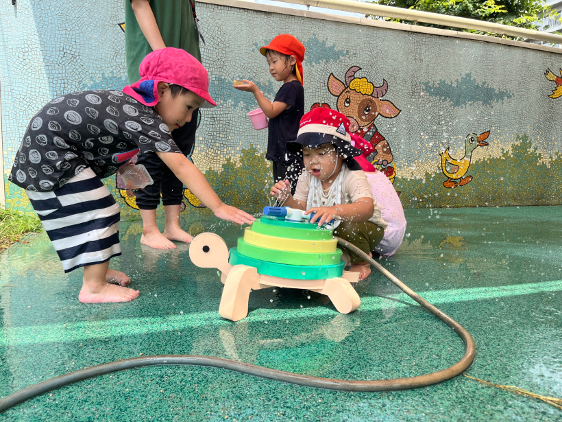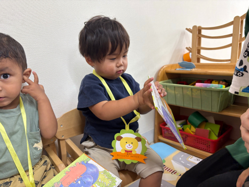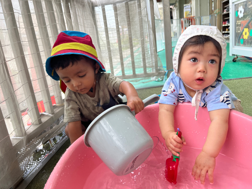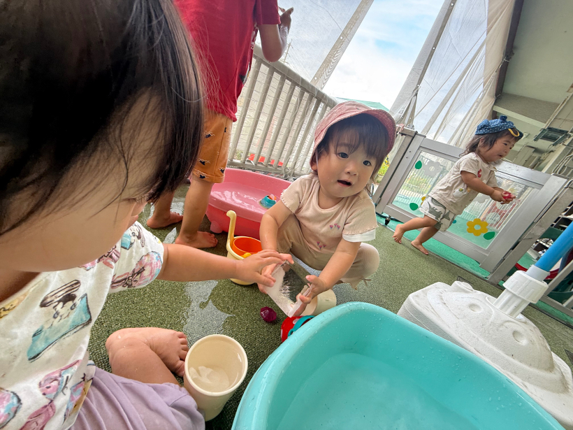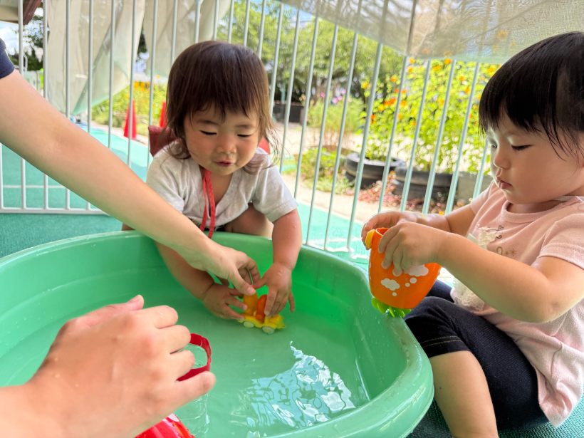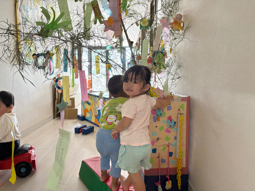 りすぐみだより【7月】 七夕でみんなで作った飾りや短冊を飾ると興味津々に短冊を見て楽しんでいました。 みんなのお願い事叶いますように! 暑い日が続きますが、水遊びや氷遊びをして過ごしました。 顔に水がかかってもへっちゃらで楽しんでいました。 7月生まれのお友だちの誕生日会をしました。 「虫眼鏡覗いてみたら」というスケッチブックシアターをすると「きりんさん」など知っている動物の名前を言う子もいました。