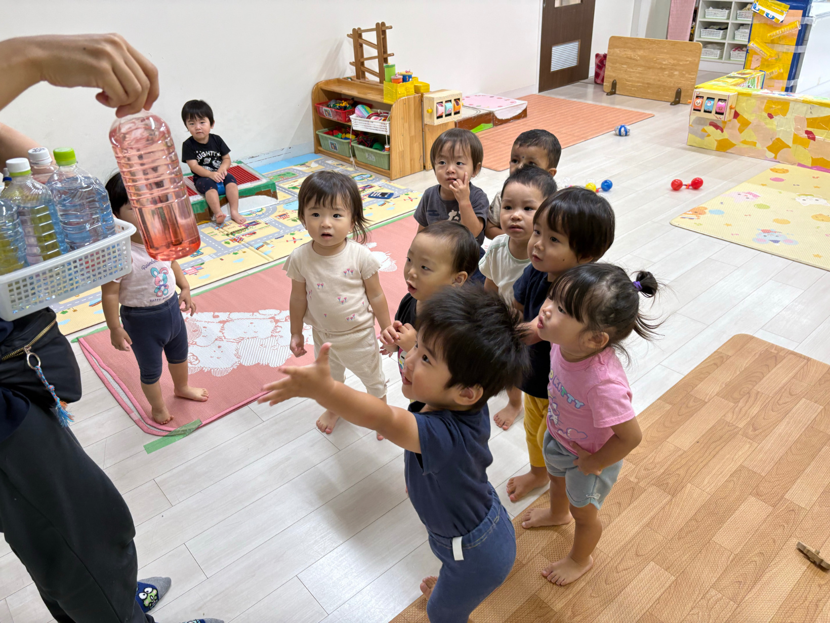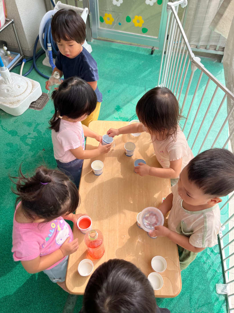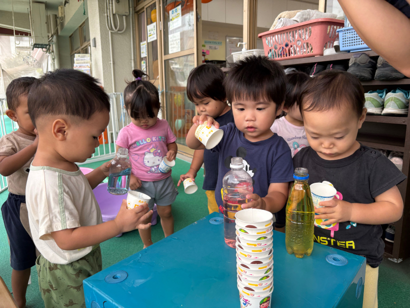 保育者やお友だちのコップにもそそいでくれて乾杯したり、ひたすらカップに注ぎ入れてあふれてくるのを楽しんだり、いろんな色があるのをおもしろがったりしていました。