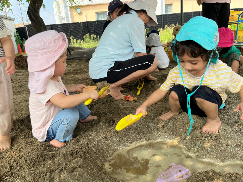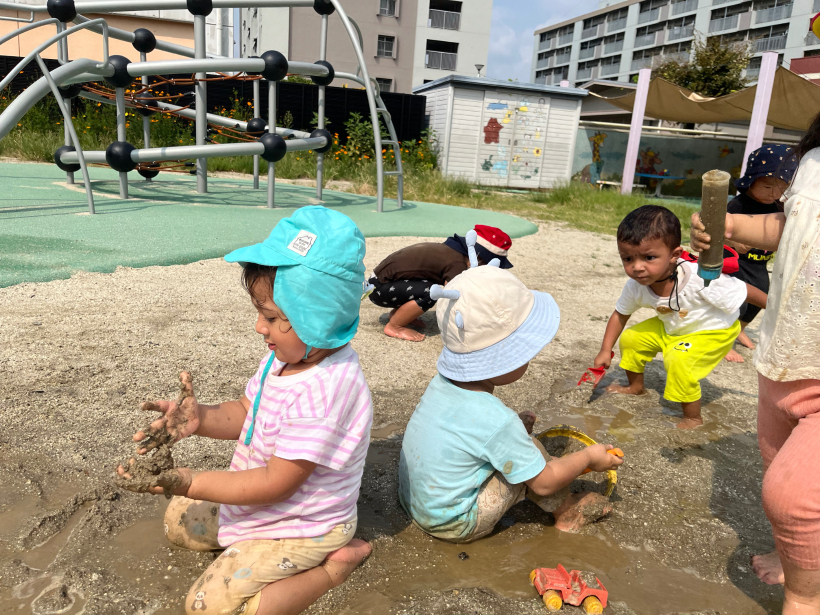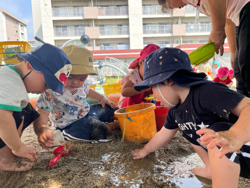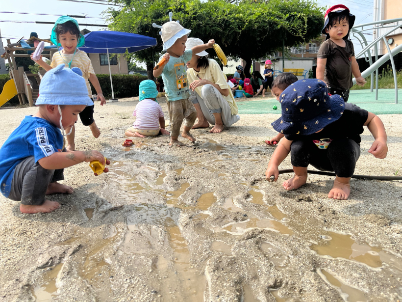 どろんこ遊びは、慣れている水遊びから始めましたが、どろんこの気持ち良さや不思議さに気がつくと、どんどん遊びが広がっていきました。