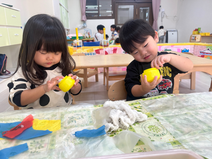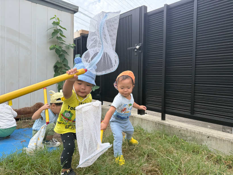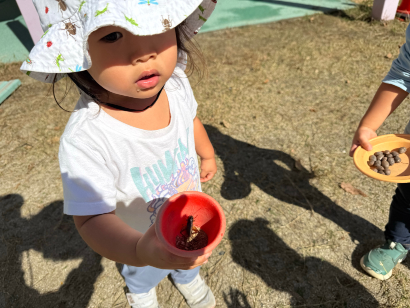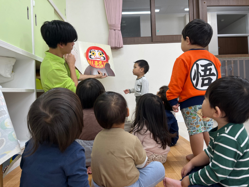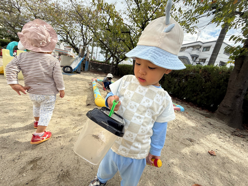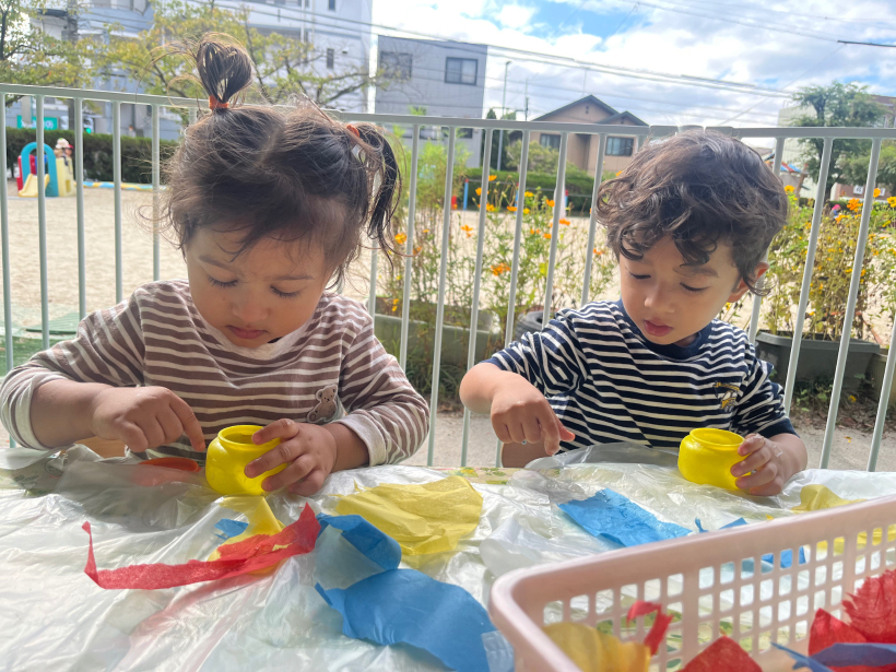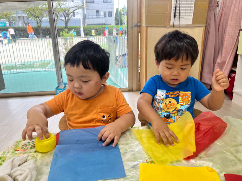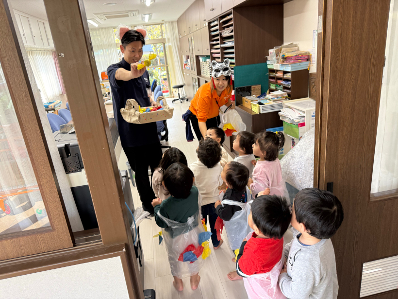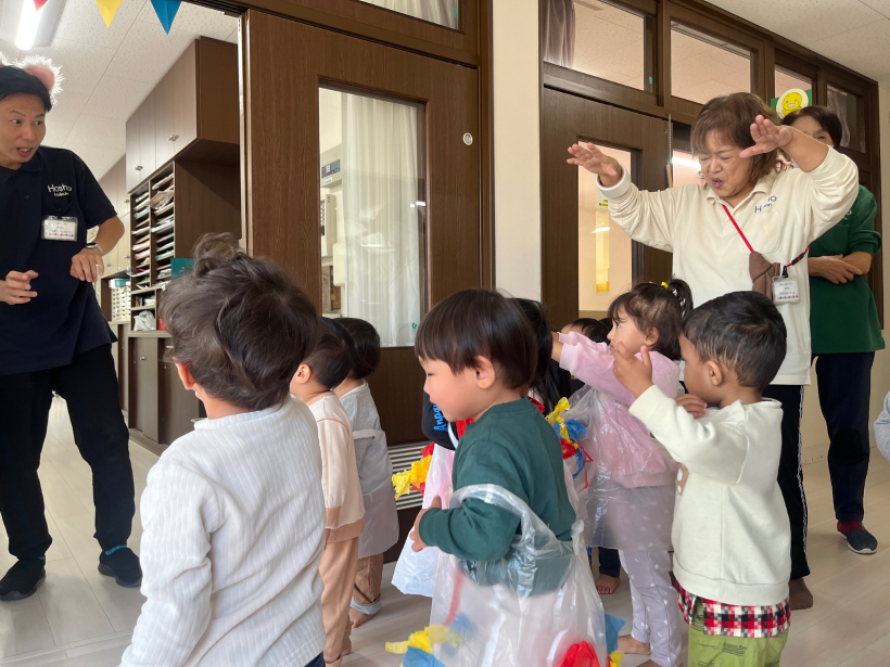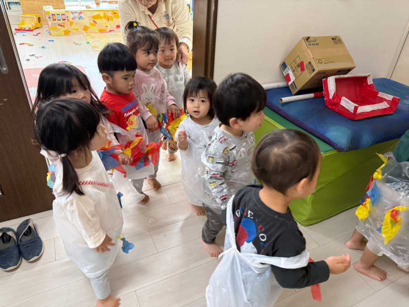 りすぐみだより【10月】 とても涼しくなった10月、虫探しが大好きなりす組さんは興味津々にコオロギや蝶々などを追いかけて虫取りを楽しみました。 ハロウィンの制作は、花紙をノリでくっつけて衣装を作りました。 ハロウィン遊びの日は、「おばけだぞー!」と他のクラスや、先生のお部屋に遊びに行きました。 キャンディを保育士から貰うと嬉しそうにしていましていました。 10月の誕生日会は、大型絵本「おめんです」をみんなで見ました。 「どのお面がいい?」と保育士が尋ねると、鬼のお面が人気でしたよ。