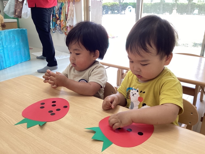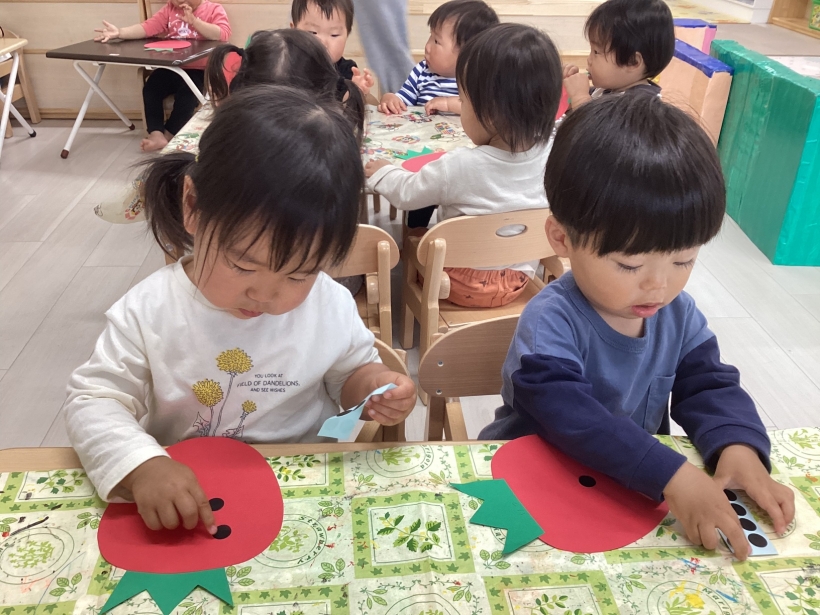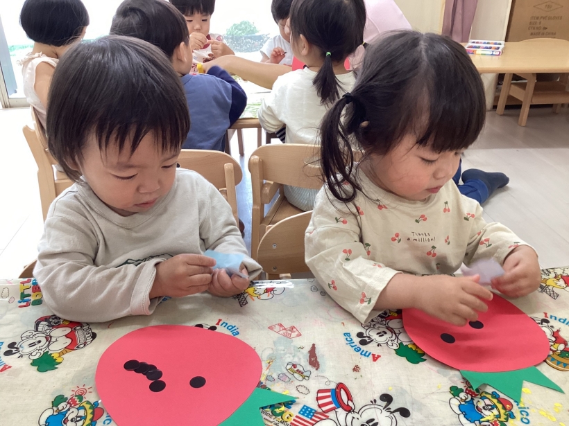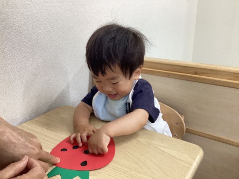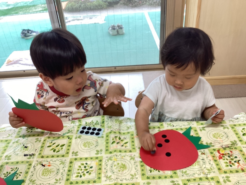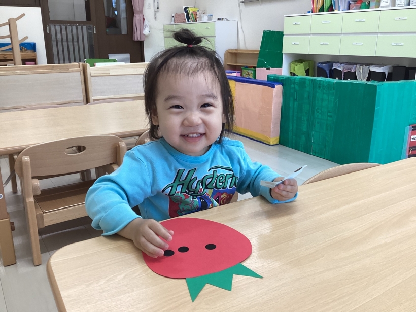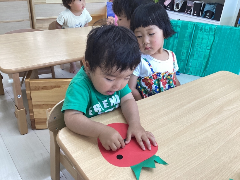 タネのシールをペタペタと、、、完成すると嬉しそうに手に持っていました。