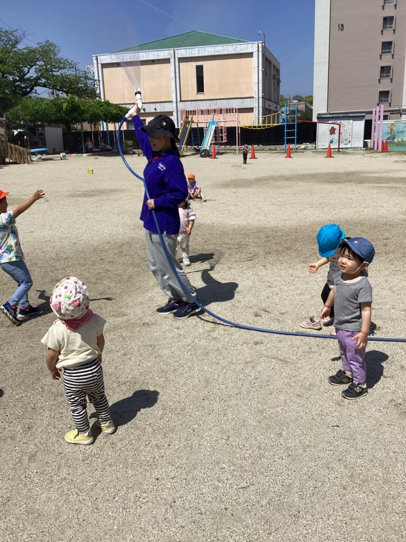 ホースでまいた水が身体にかかるととても気持ち良さそうでした。
