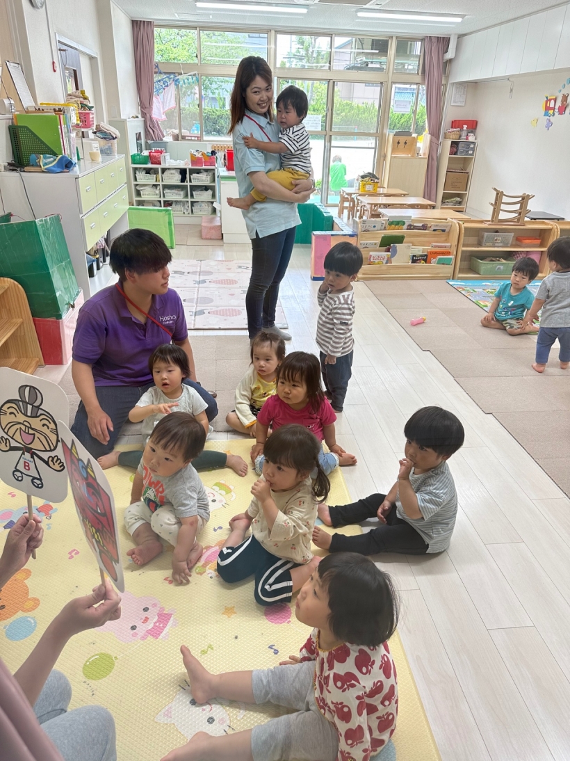 5月の誕生会では「いないいないばぁちゃん」のペープサートを見ました。