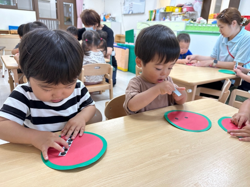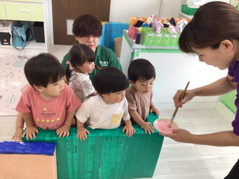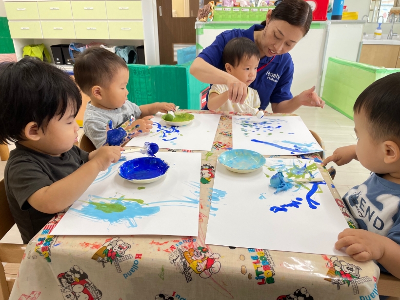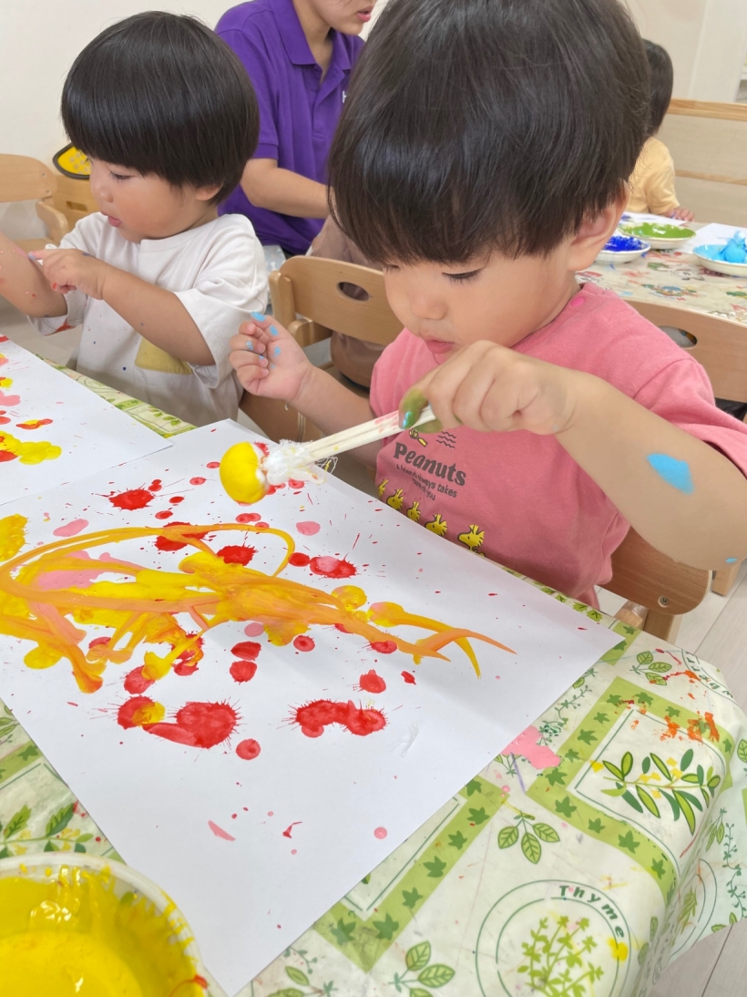 初めての絵の具にみんな興味津々で、絵の具を混ぜて色が変わると不思議そうな顔をしていました。