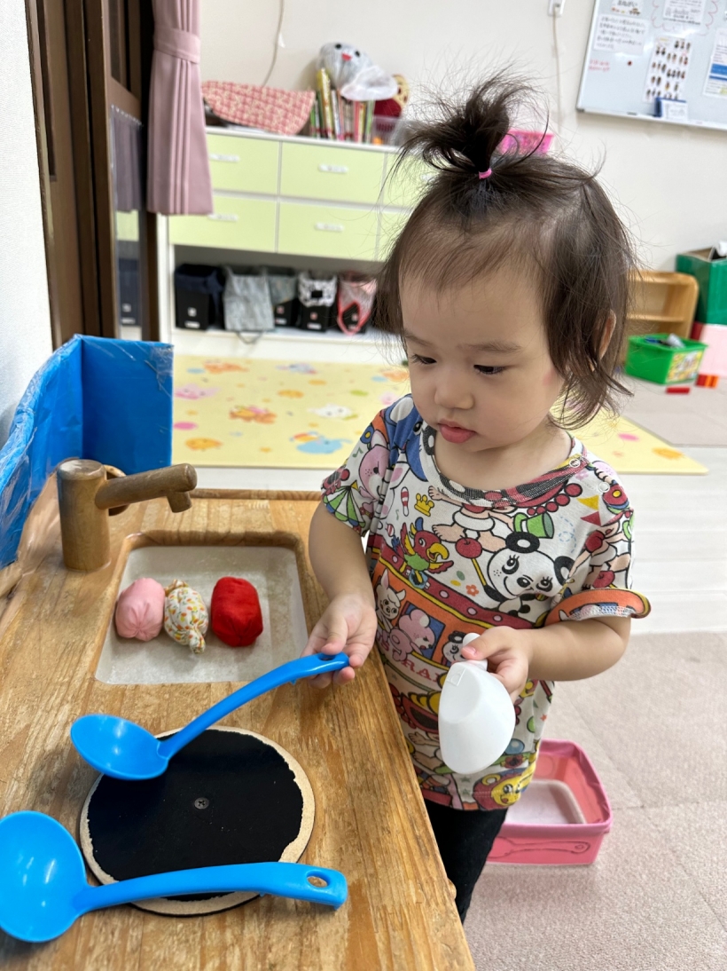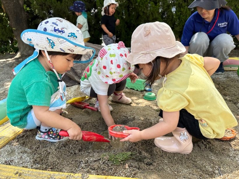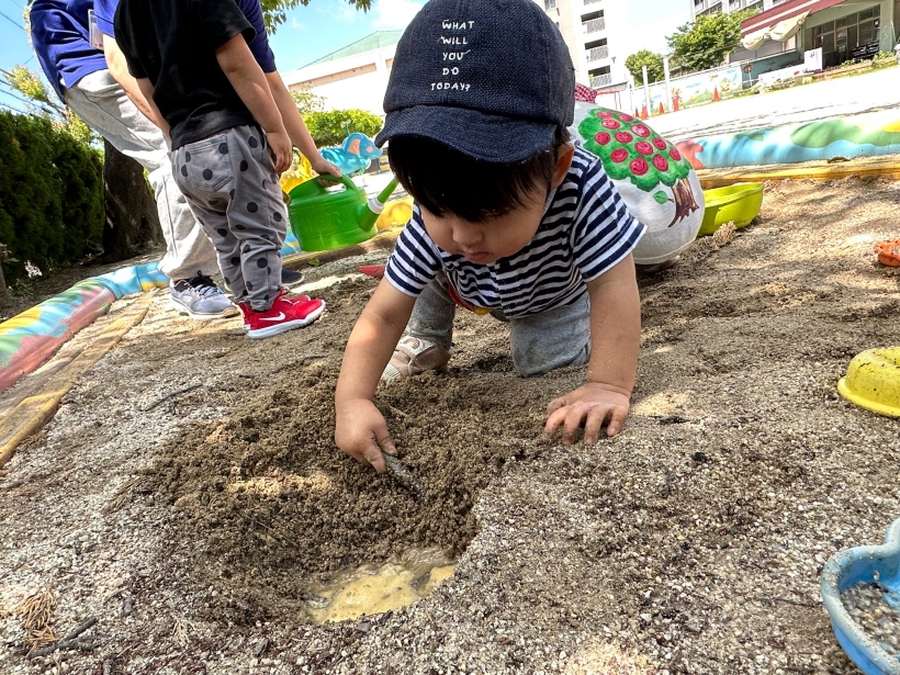 砂場に水を注ぐところから大興奮で、いつも触っている砂との感触の違いを楽しみました。
