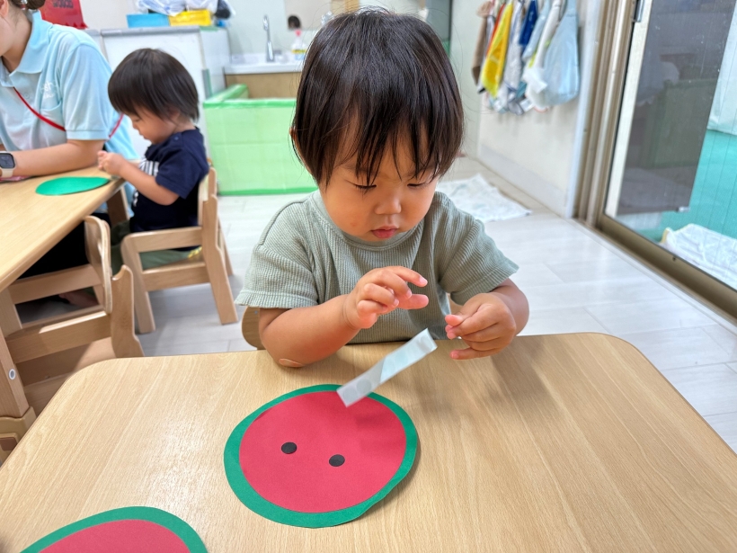 シールを剥がすことに苦戦しながら頑張って自分でシールを貼っていました。