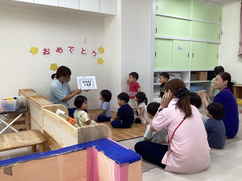 6月の誕生会では「はたらくくるま」のスケッチブックシアターをしました。