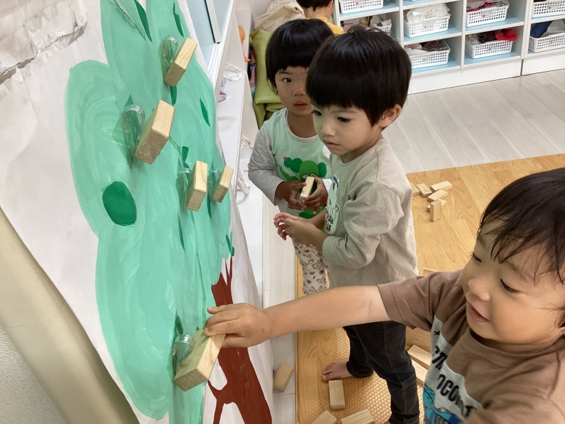どんぐりだけじゃなく、積み木など好きなおもちゃも引っ掛けて楽しんでいます。