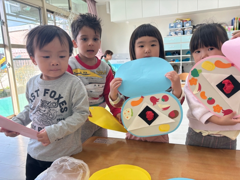 おにぎりはうさぎ組の子が自分で折り紙を半分に折っており、その上からおにぎりの具と海苔をつけています。