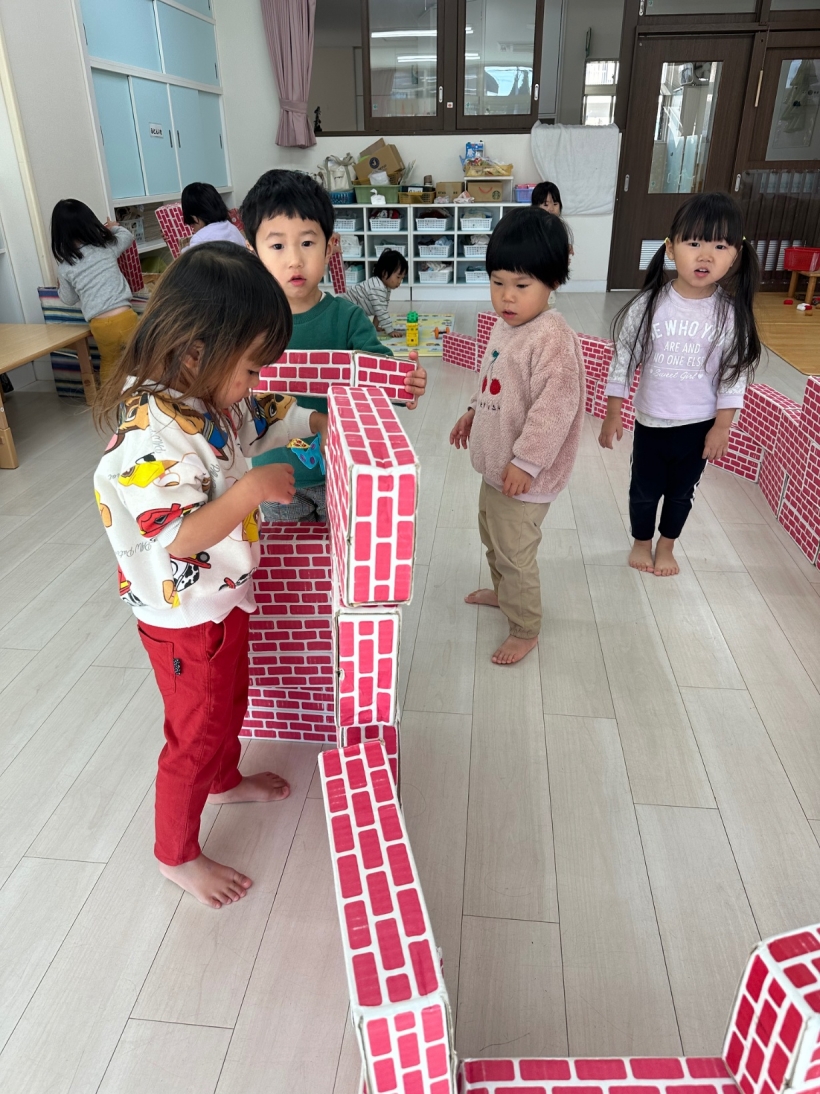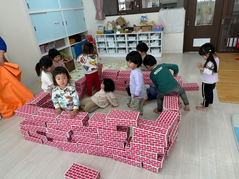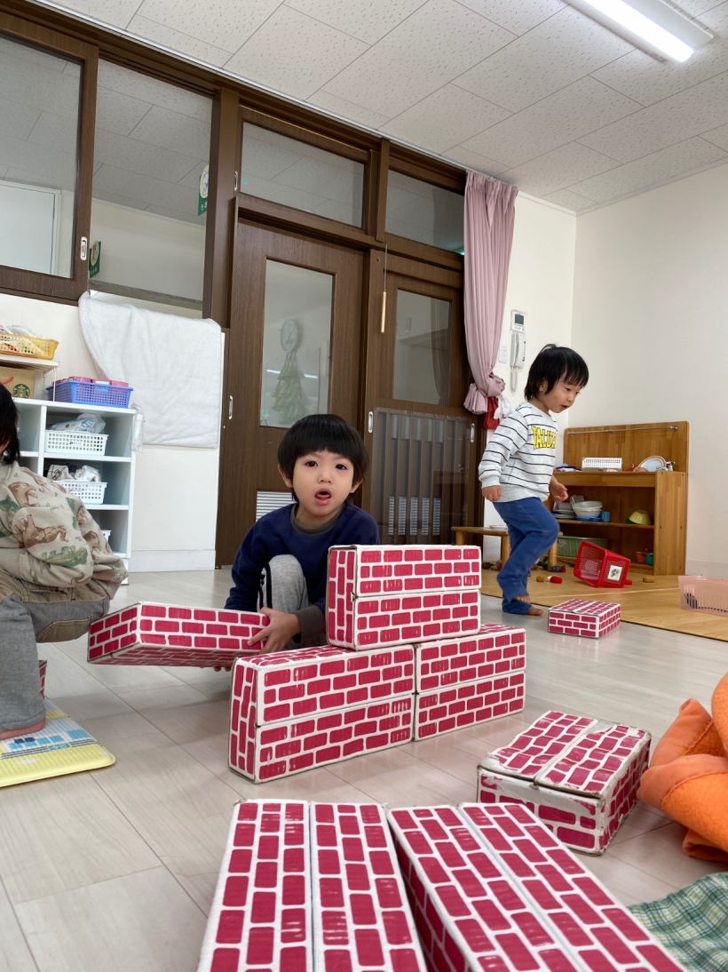 大きなレンガ積み木を使ってお部屋で遊びました。