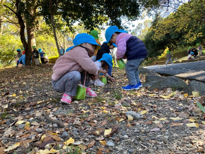 公園では、どんぐりがたくさん落ちていて「こっちにもあるよー」と嬉しそうに拾ってお散歩バッグに入れていました。