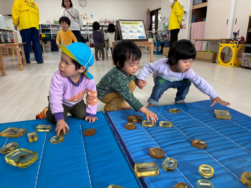 おじゃま虫キャラバンで虫がたくさん展示されているのを見て「これは何て名前?」とそこにいる全ての虫たちに興味津々の様子でした。