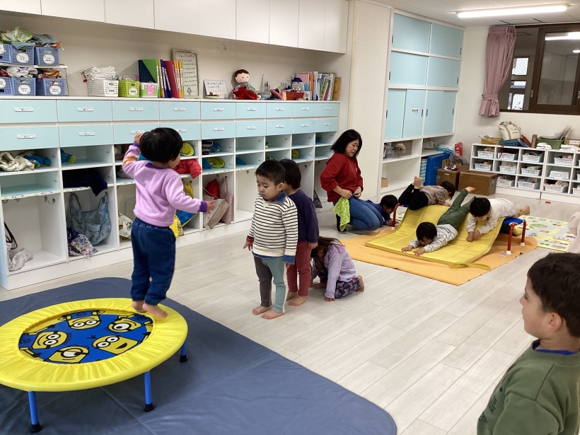 雨の日は室内でトランポリンやトンネルなどを出し、サーキットのようにして遊びました。