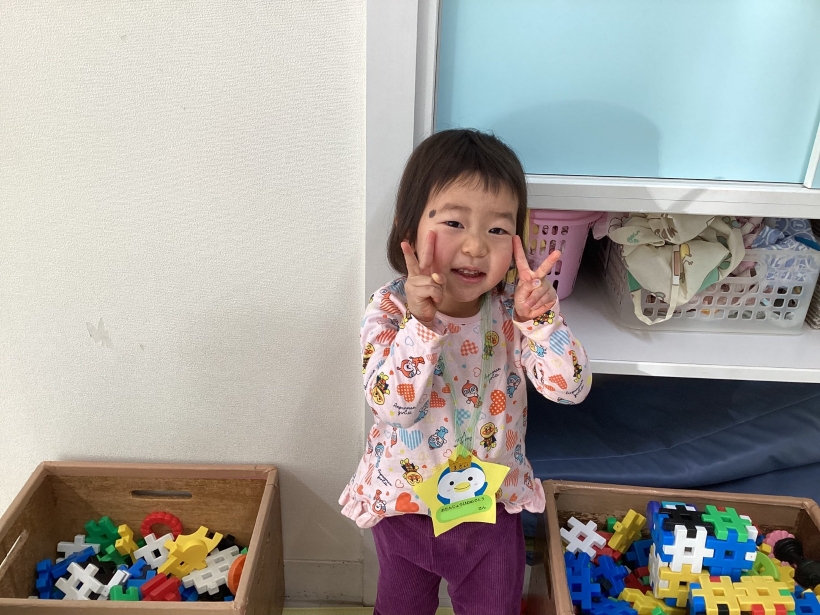 お誕生日の子が最後に出てきたケーキのろうそくの火を消してお誕生日メダルを貰うと、みんなで「おめでとう!」と言ってお祝いをしました。