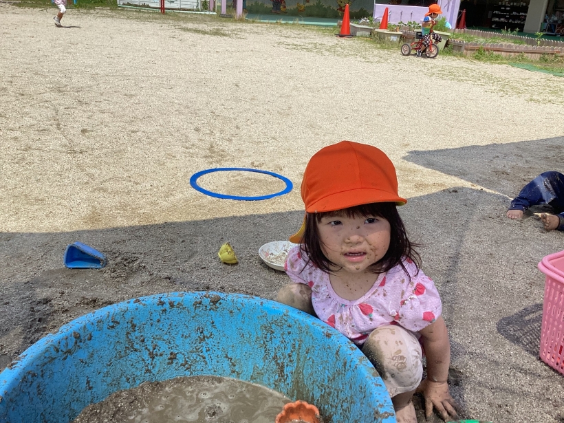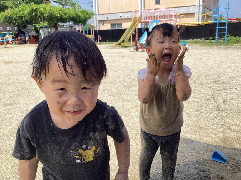 みんなが大好きな泥んこ遊び。雨上がりの水たまりも、すぐに泥遊びに早変わり。