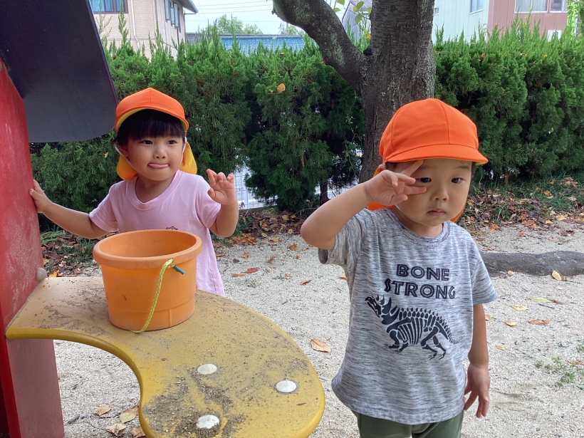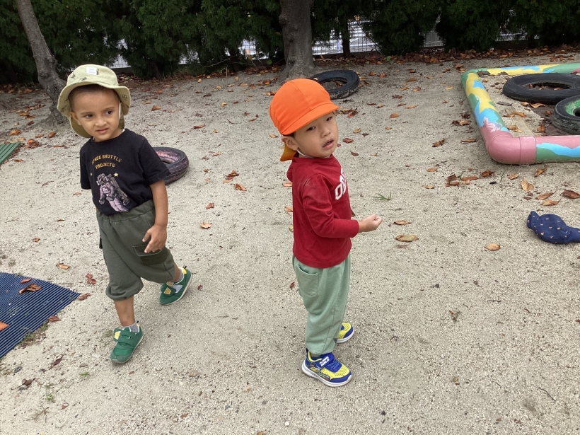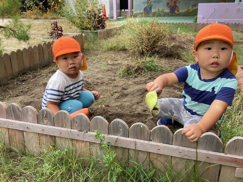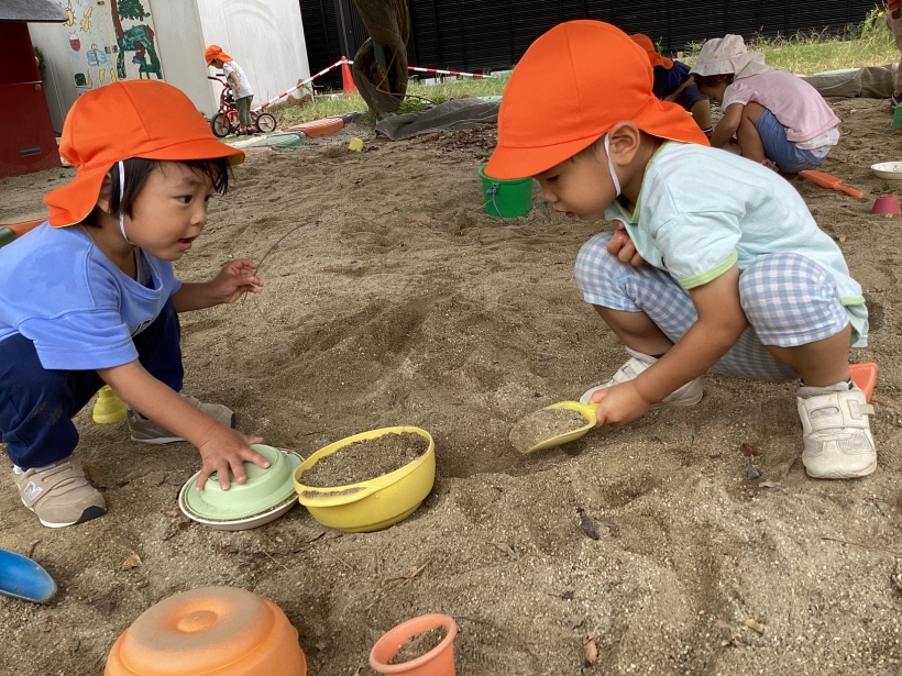 園庭では、お店屋さんごっこが開かれていたり、友だちと砂場で一緒に何か作ったり友だちと関わって遊ぶ姿がたくさん見られるようになってきました。大好きな虫探しも楽しんでいますよ!!