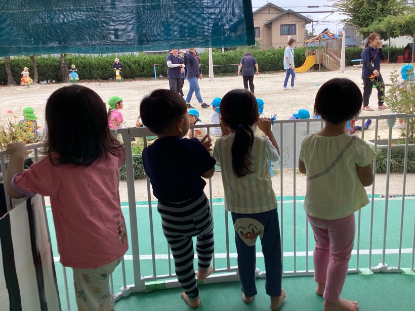 運動会ごっこをしている幼児クラスのお兄さんお姉さんを憧れの眼差しで見ている子どもたち。