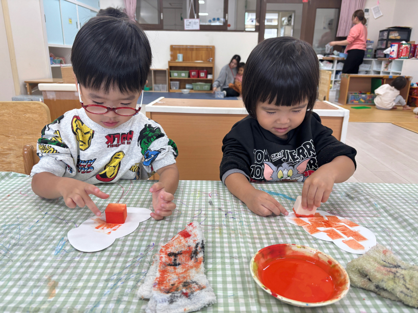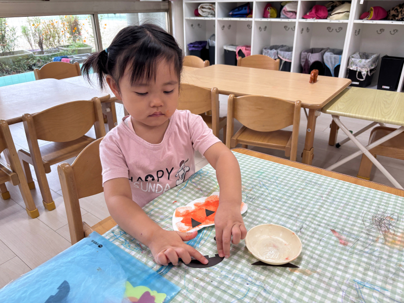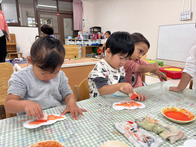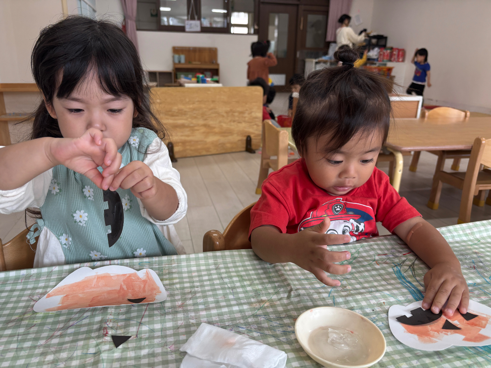 スポンジを「ふわふわー」と触ったり、かぼちゃに色をつけました。