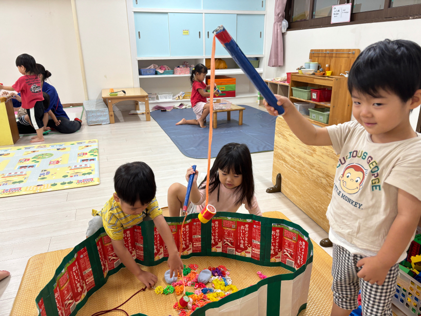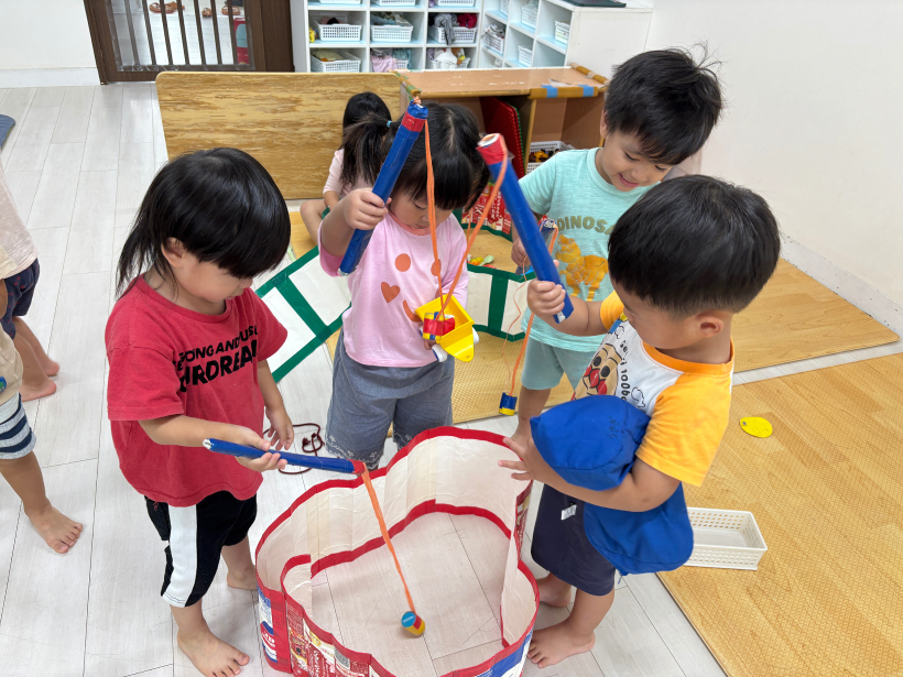 チェーンリングを魚に見立てて「かめさんいた!」「つれたー」と