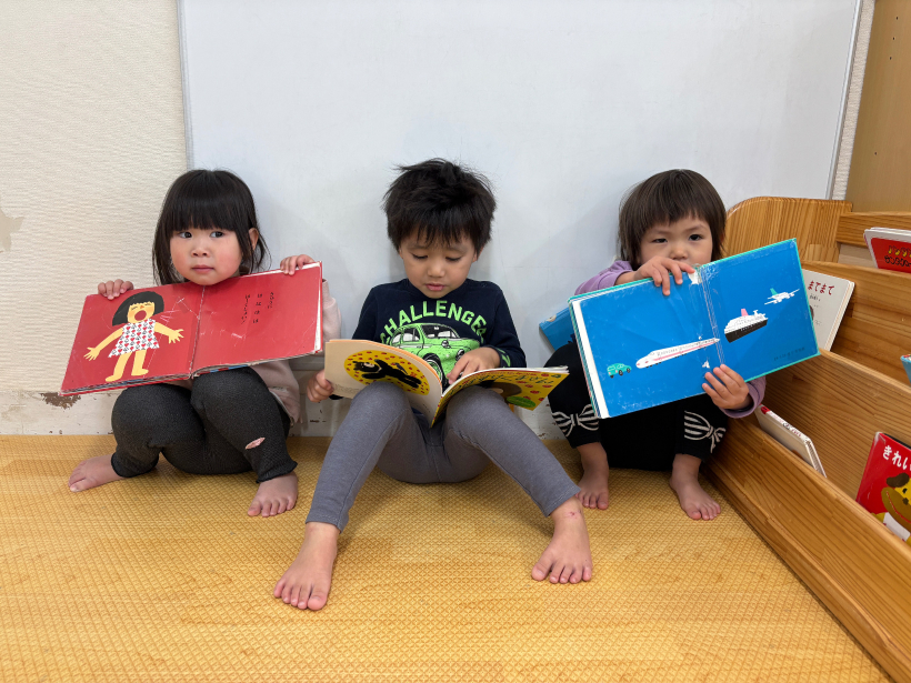 朝の会で絵本を読む先生の真似っこ。