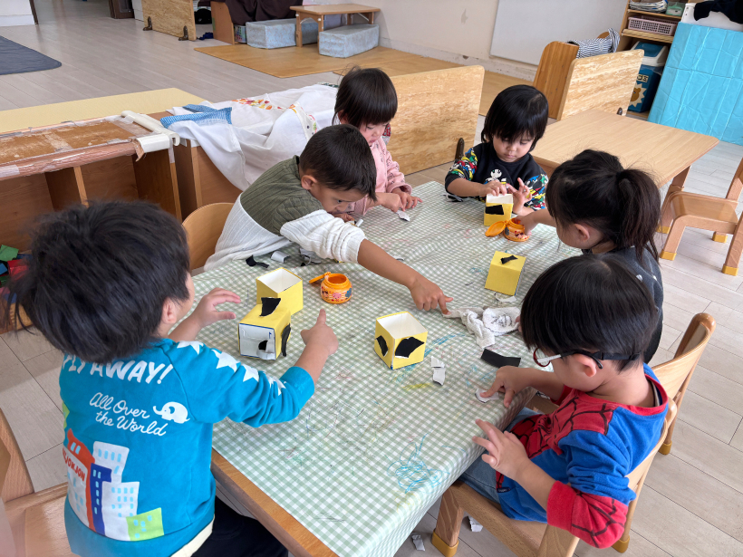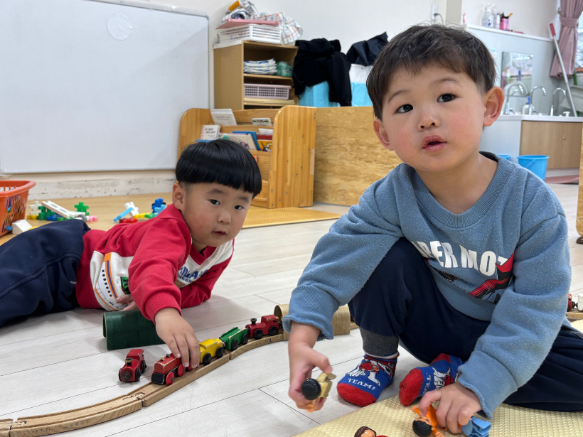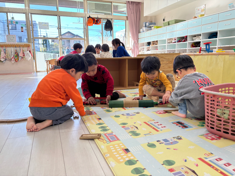お友だちと「いってくださーい」「ガタンゴトーン」と話しながら楽しんでいます。