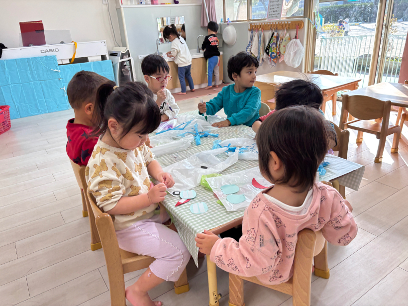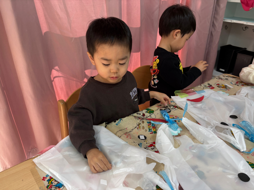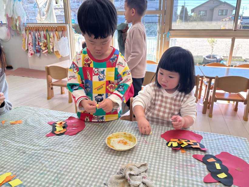 鬼は画用紙を切って頭に貼りました。「ちょーき、ちょーき」と真剣にハサミを使っていましたよ。